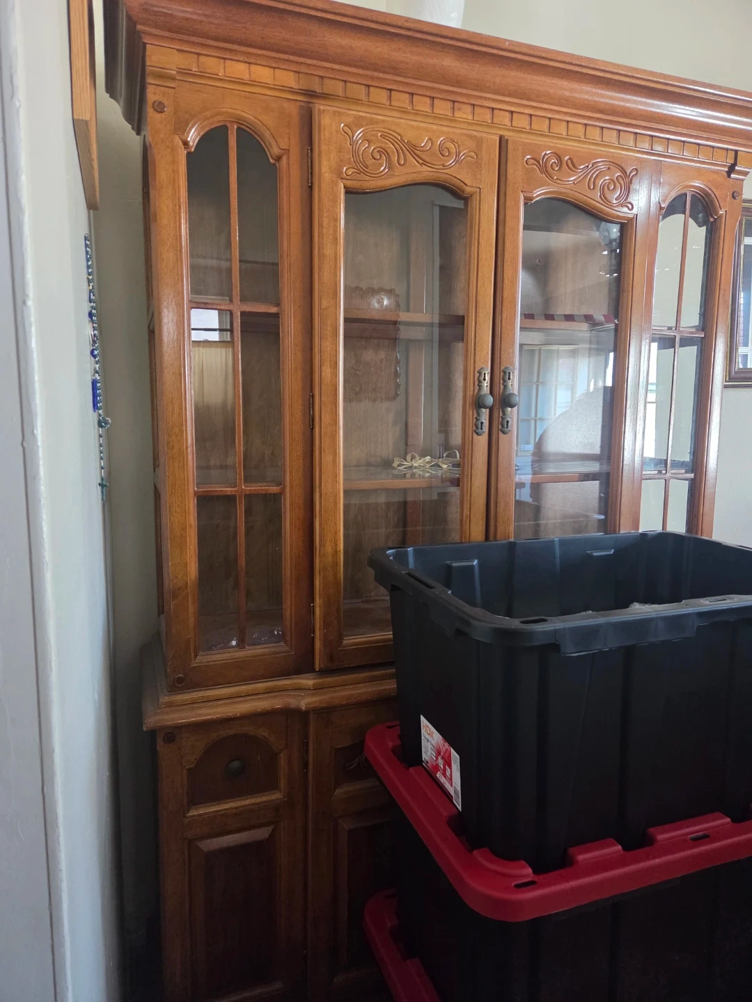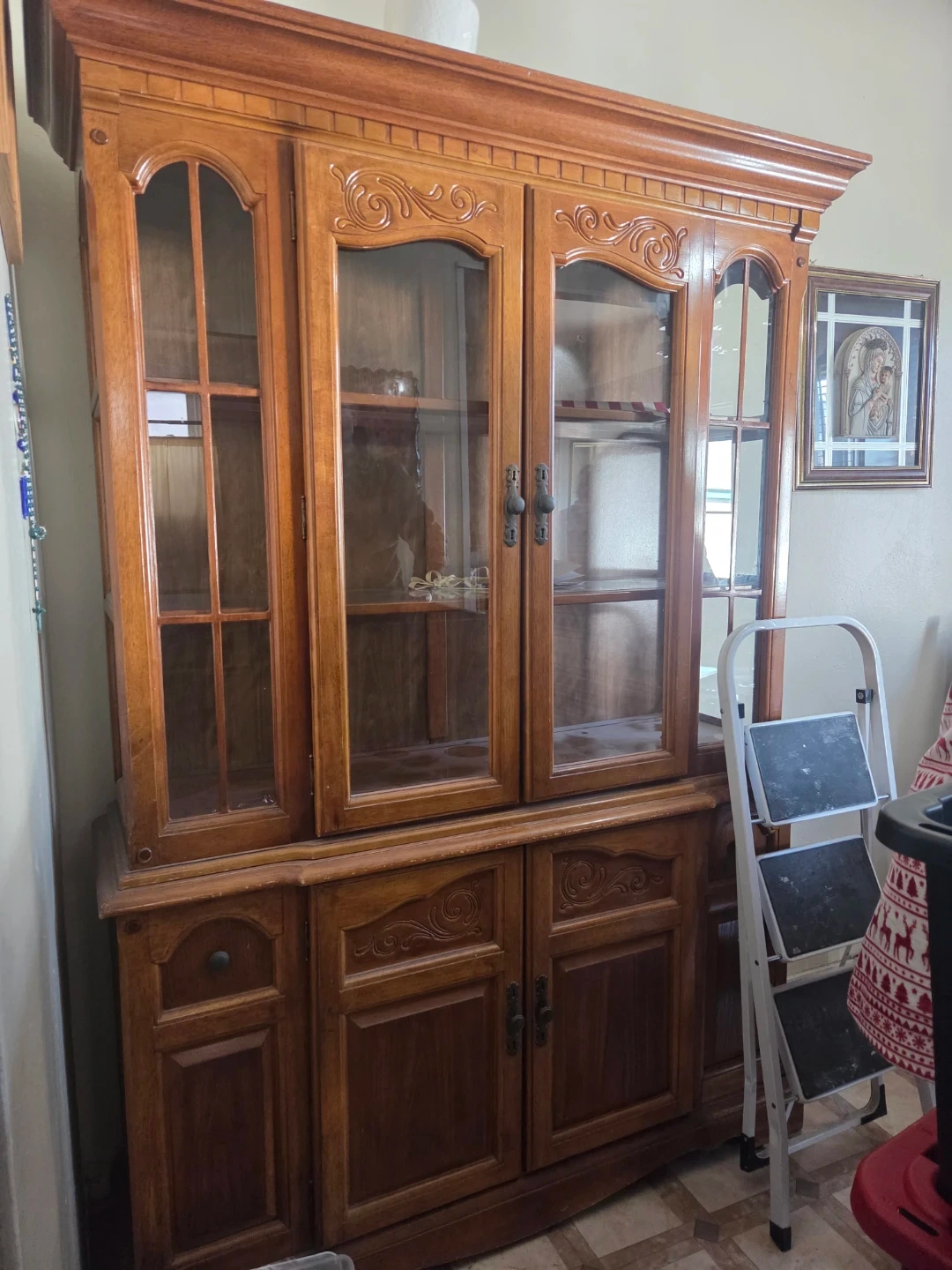 This wooden china cabinet features glass doors for displaying your items. It has decorative carvings and antique-style handles. Wood material.