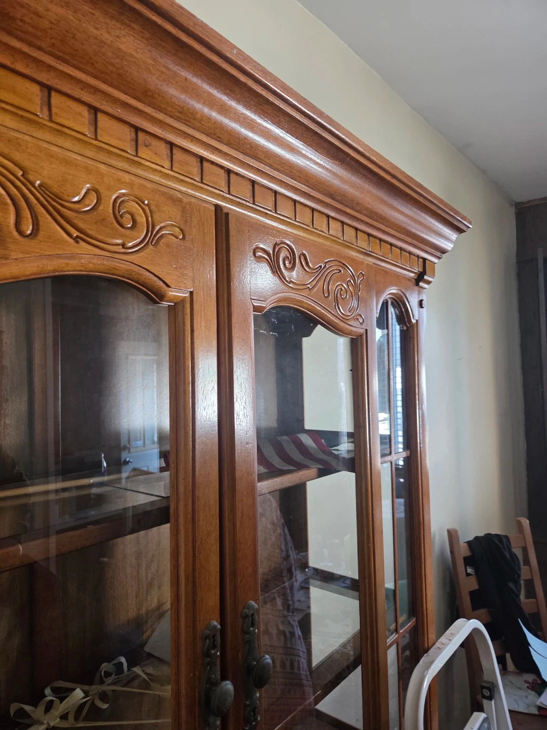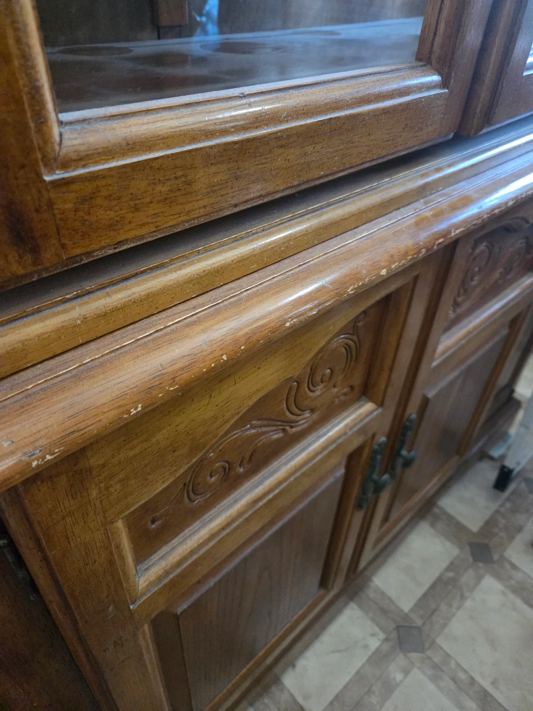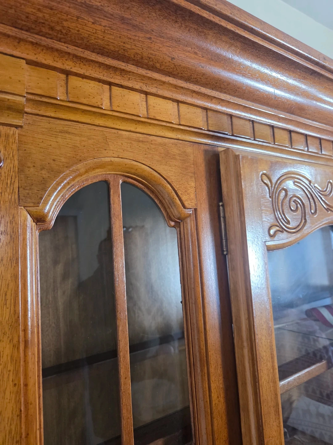 This wooden china cabinet features glass doors for displaying your items. It has decorative carvings and antique-style handles. Wood material.