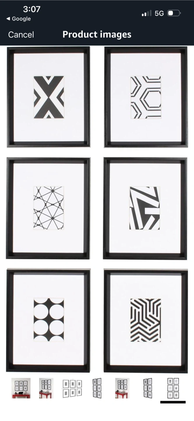 This set includes six black frames, each featuring a unique geometric art print. They're perfect for adding a modern touch to any room's decor. Each frame is ready to hang and displays a bold, abstract pattern.
