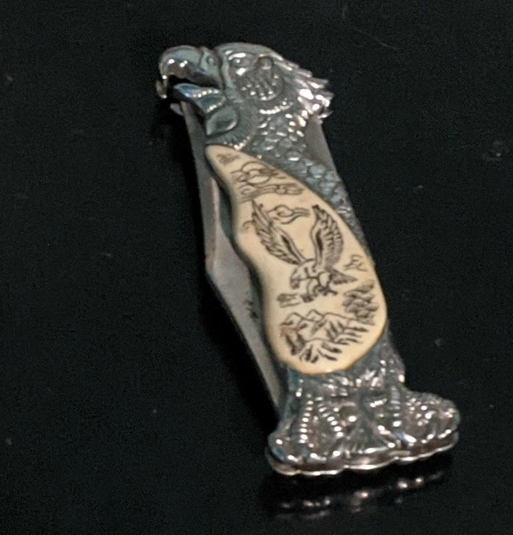 39Here's a unique pocket knife featuring an eagle design. It has a detailed eagle head handle and an eagle engraving on the side. It appears to be in good condition!