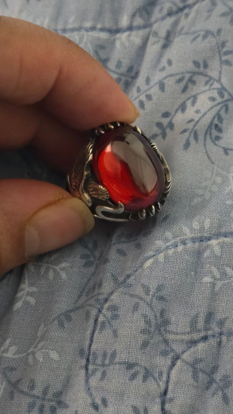 68Here's a unique eagle ring featuring a red stone. It has an intricate design with an eagle on either side of the stone. A striking piece for anyone who likes bold jewelry! Selling immediately will take cash.