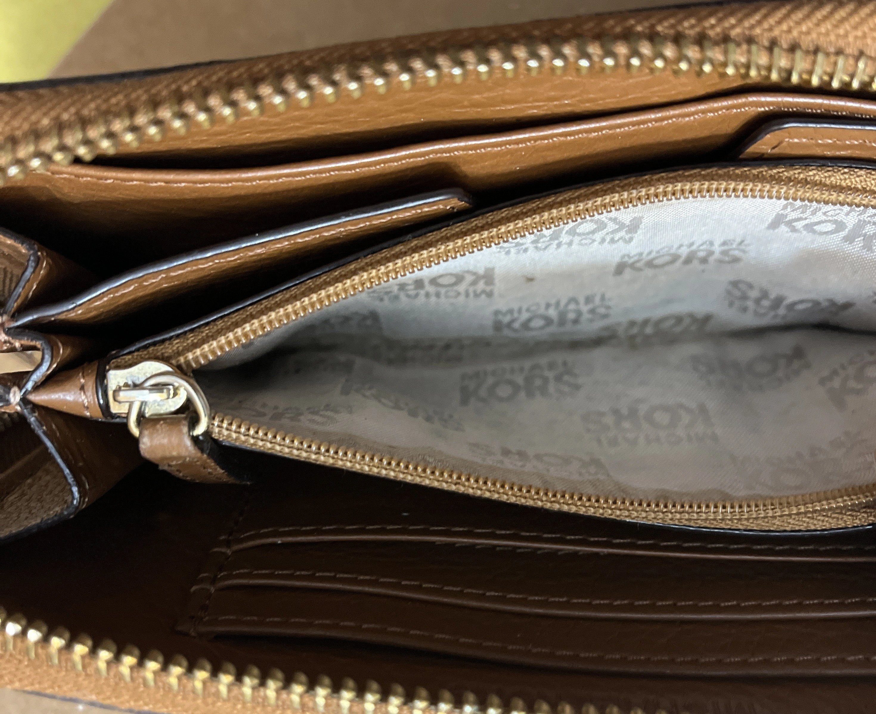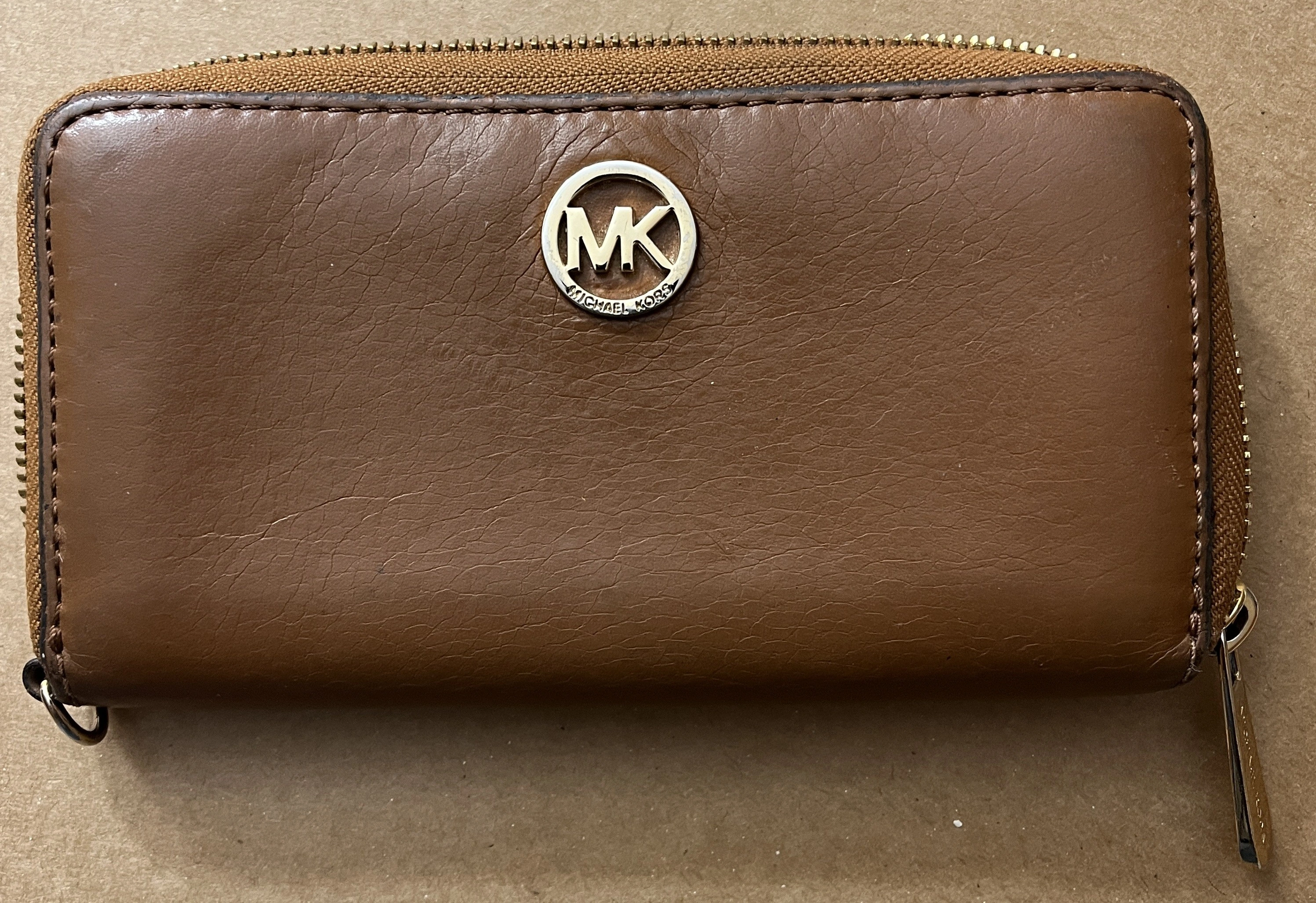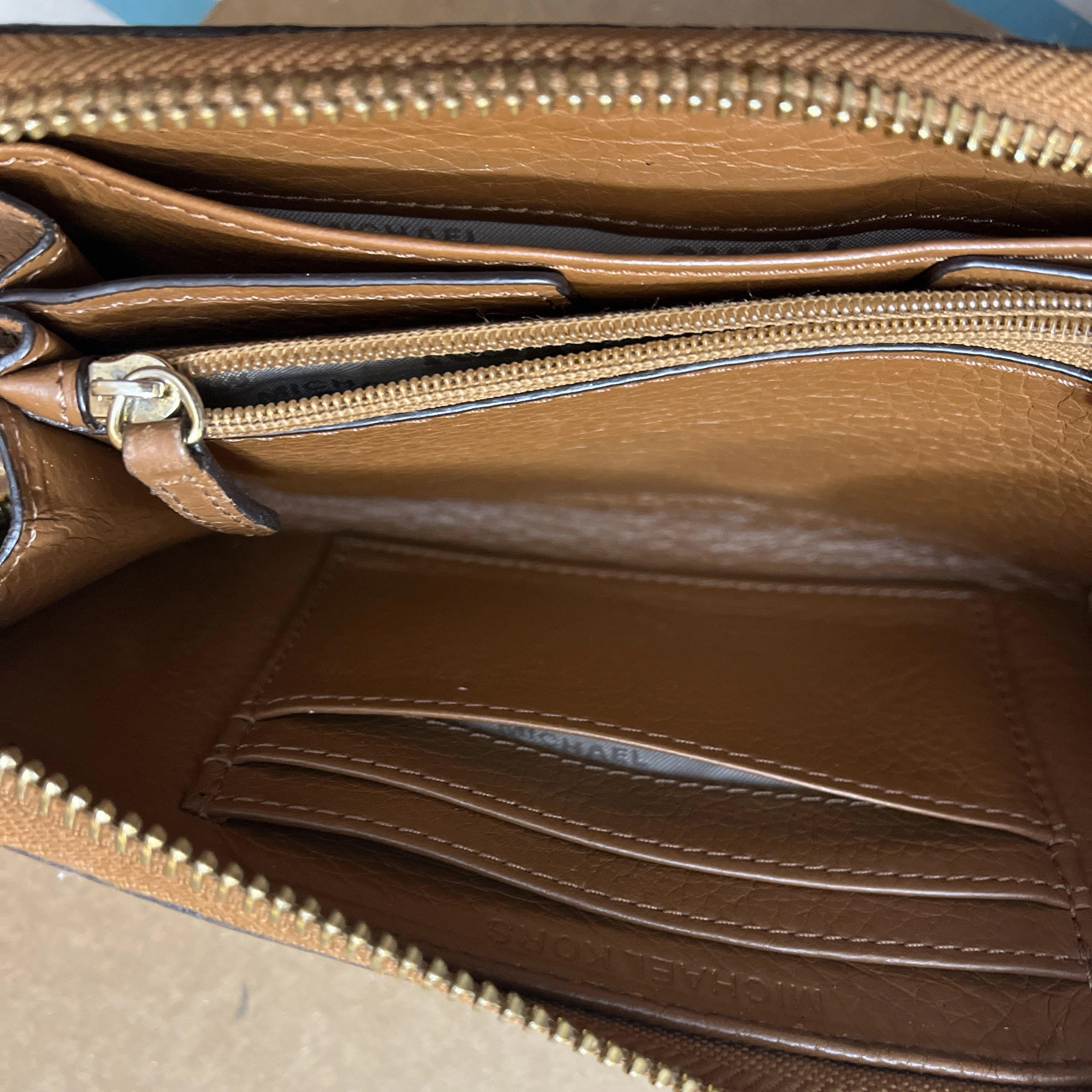 Selling a Michael Kors brown leather wallet. It's in great condition and has lots of space for cards and cash. Perfect for everyday use!
