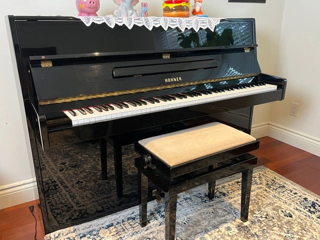 Used Hohner piano in great condition with a glossy black finish. Comes with a matching bench. This piano would be perfect for a beginner or experienced player. Features 88 keys and 3 pedals. If the ad is up, it's available!