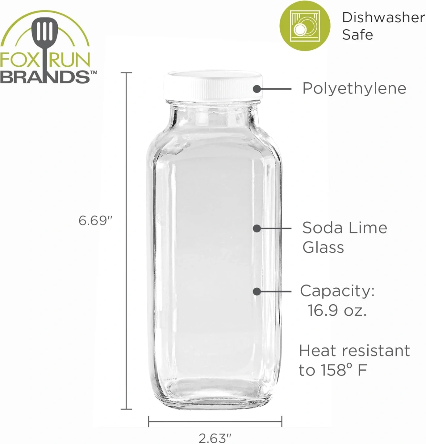 This is a 16.9 oz glass bottle from Fox Run Brands, featuring a white screw-on lid. It's made of soda lime glass and is heat resistant up to 158° F. This bottle is also dishwasher safe. It's useful for storing beverages or dry goods.