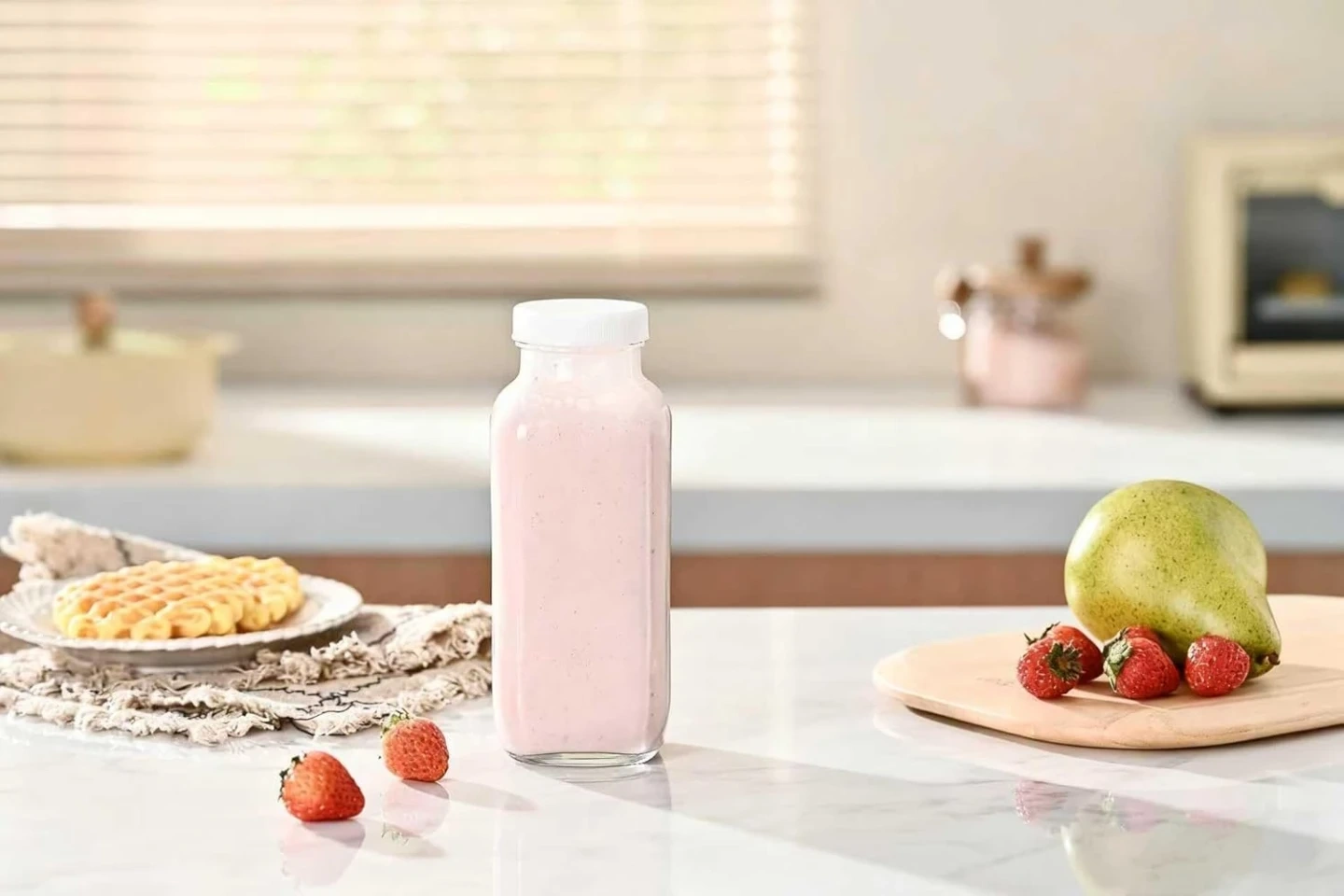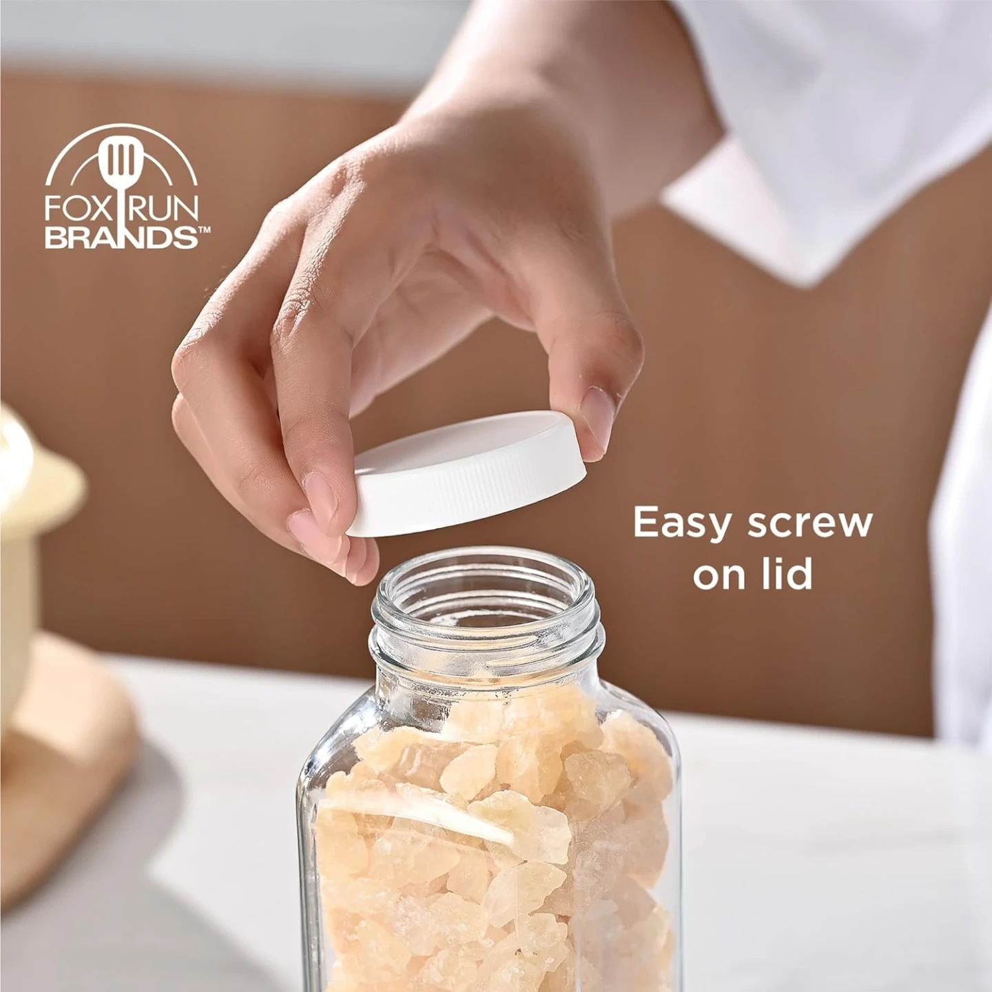 This is a 16.9 oz glass bottle from Fox Run Brands, featuring a white screw-on lid. It's made of soda lime glass and is heat resistant up to 158° F. This bottle is also dishwasher safe. It's useful for storing beverages or dry goods.