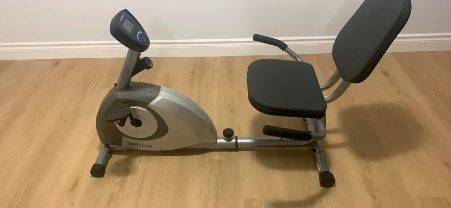 This is a Body Champ 1350 recumbent exercise bike. It features an adjustable seat and a digital fitness monitor. Perfect for home workouts!