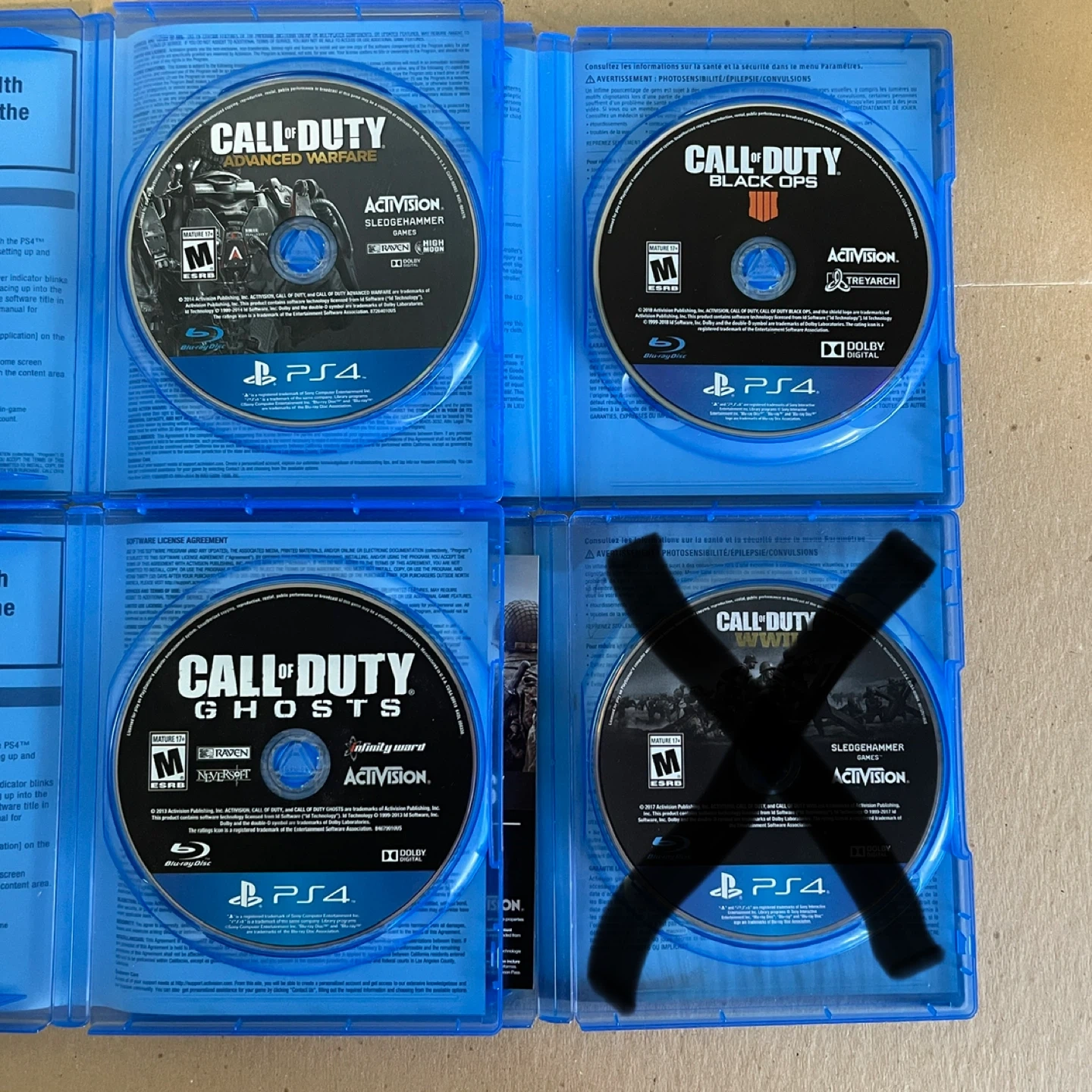 Call of Duty games for PlayStation 4. Includes Advanced Warfare, Black Ops 4, and Ghosts. Can sell individually for $20 each.