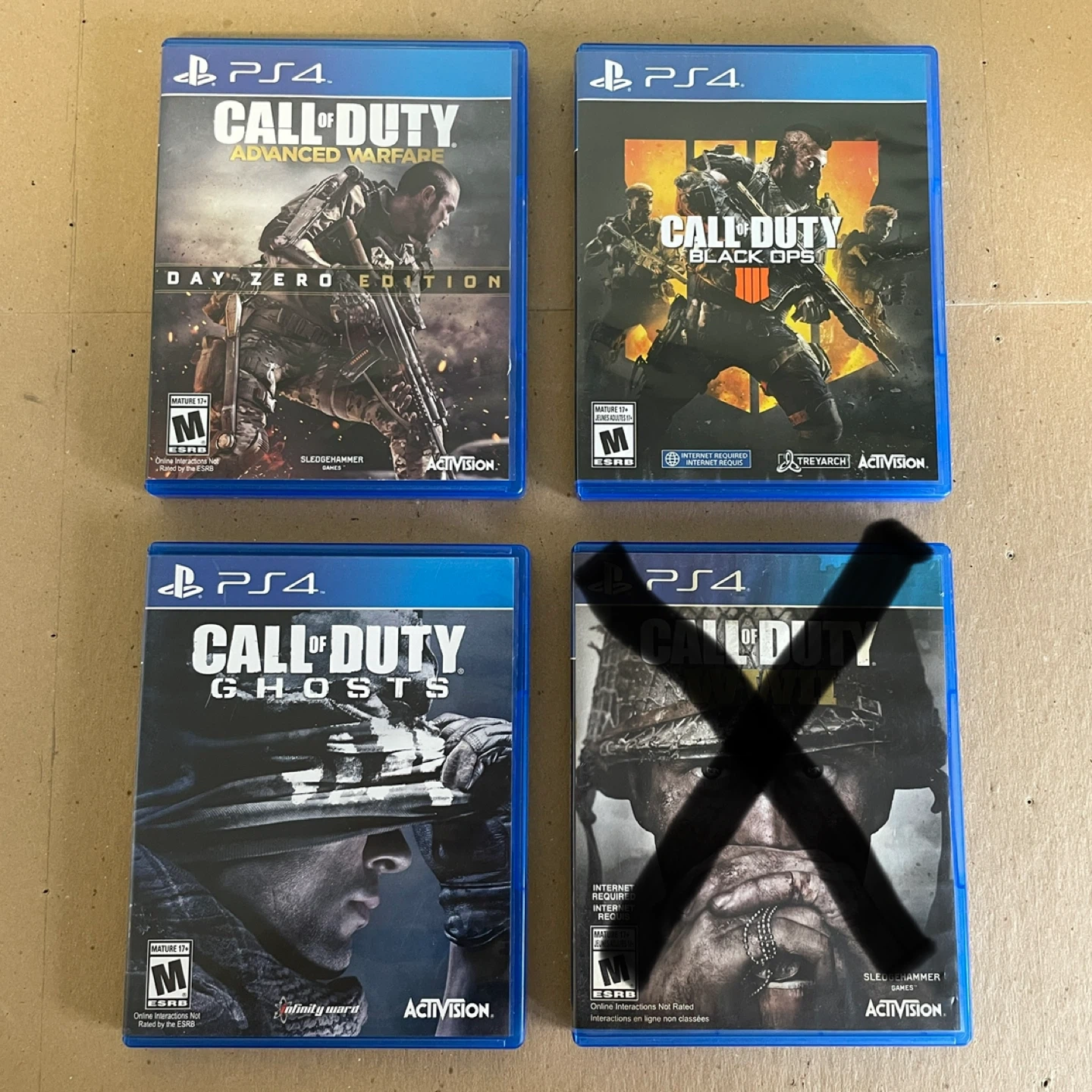 Call of Duty games for PlayStation 4. Includes Advanced Warfare, Black Ops 4, and Ghosts. Can sell individually for $20 each.