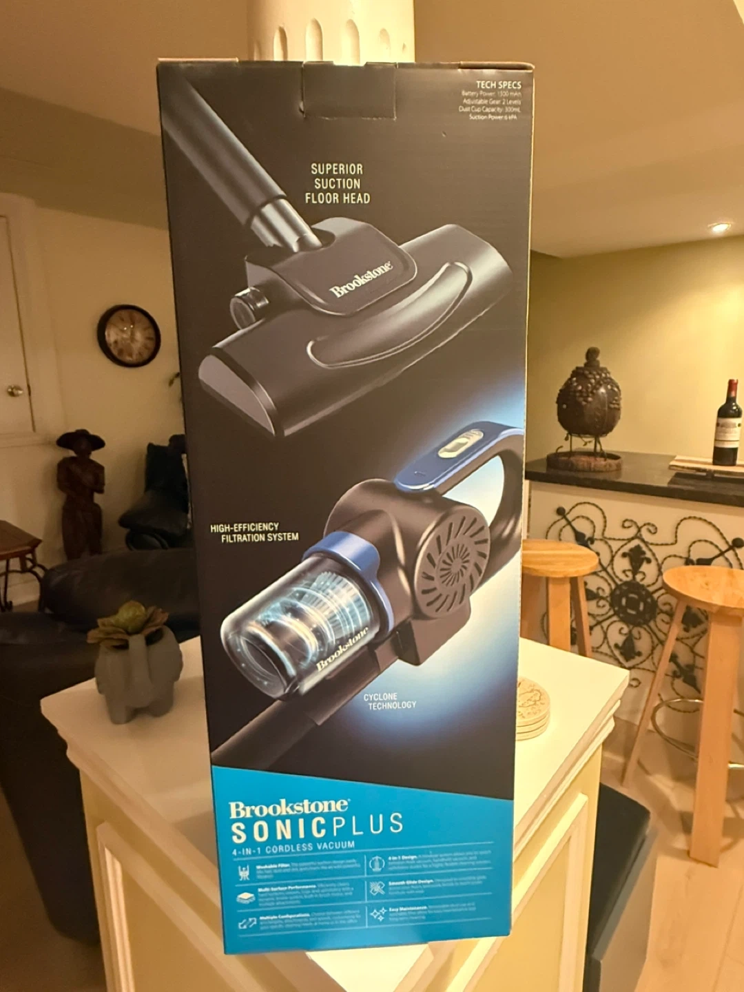 Brookstone SONICPLUS 4-in-1 cordless vacuum system. It features a 1500 mAh battery, 2 adjustable gears, and 6 kPa suction power. The dust cup capacity is 300mL. This vacuum offers multi-surface performance and a smooth glide design.