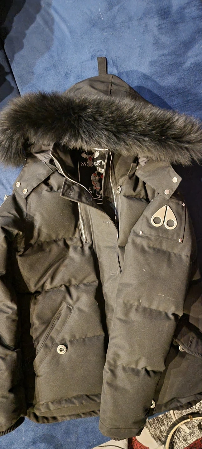 Black Moose Knuckles down-filled parka jacket. Features a fur-lined hood and embroidered hockey graphic inside. Made in Canada. Size ladies medium.