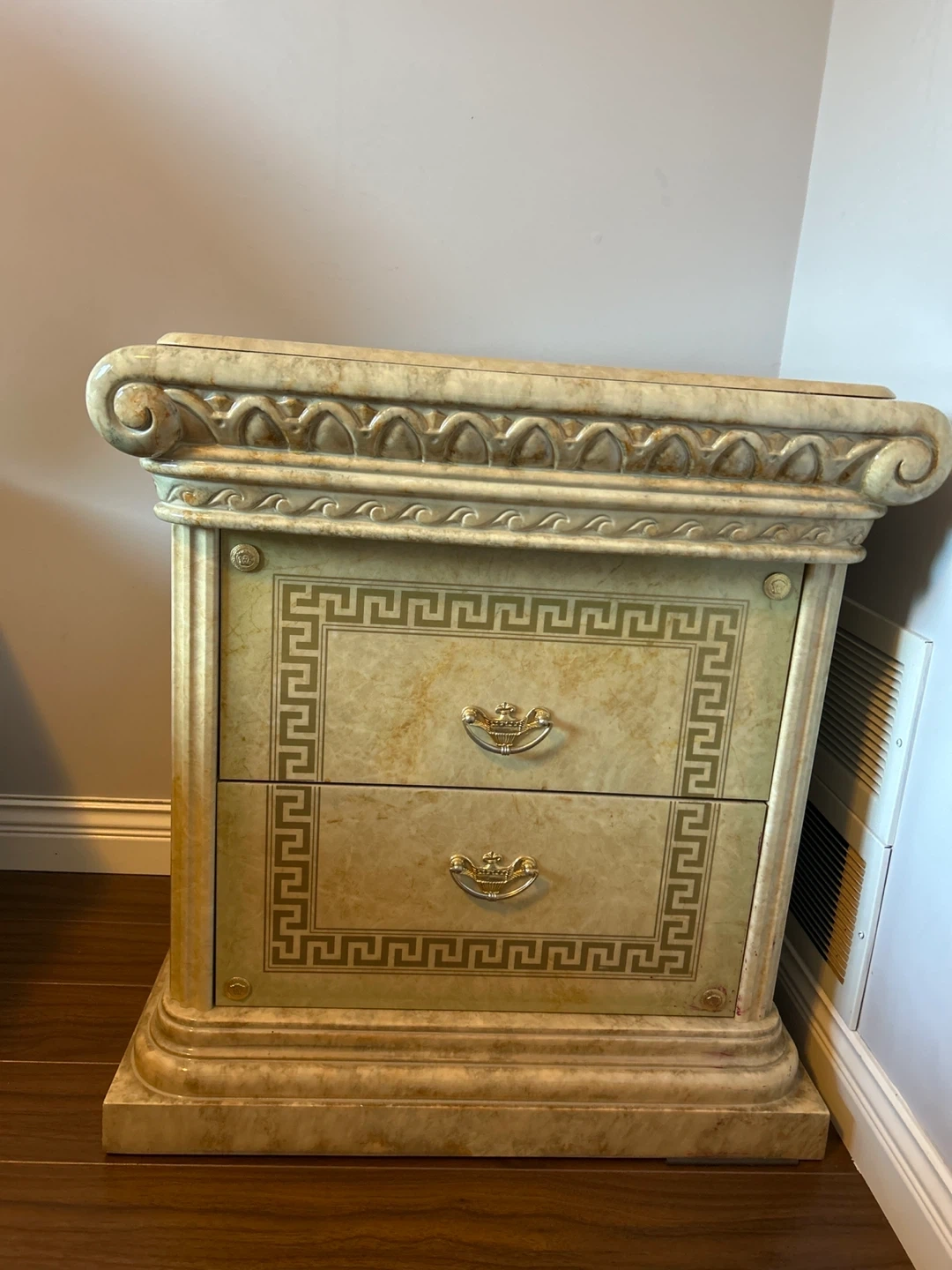 Selling a vintage nightstand with two drawers. It has a unique design with decorative golden accents. Perfect for adding a touch of classic style to your bedroom!