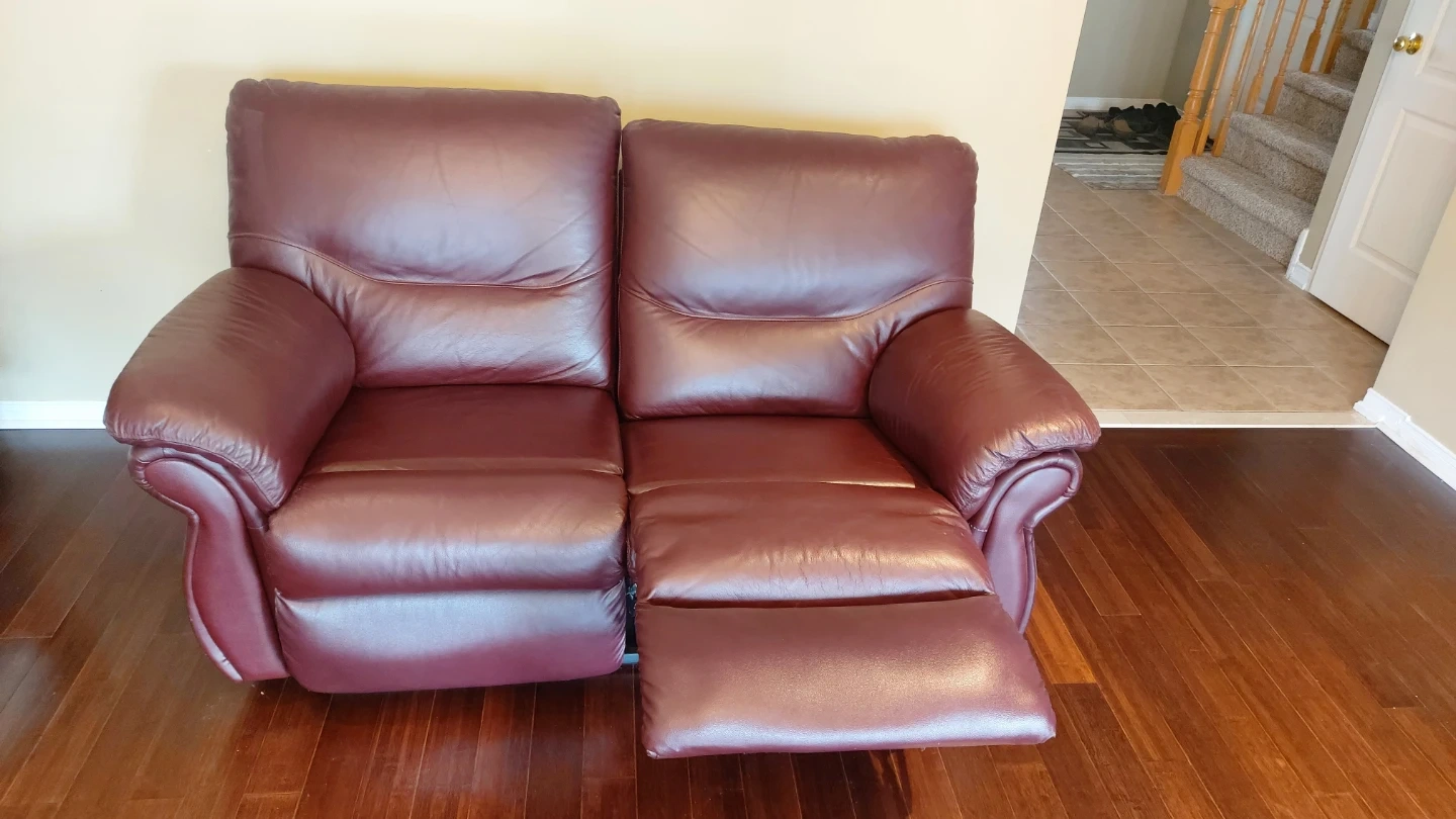 A burgundy leather loveseat with two reclining seats. It's upholstered in leather and offers a comfortable seating option. This loveseat would be great for a small living room or den. The other sude is not reclining.