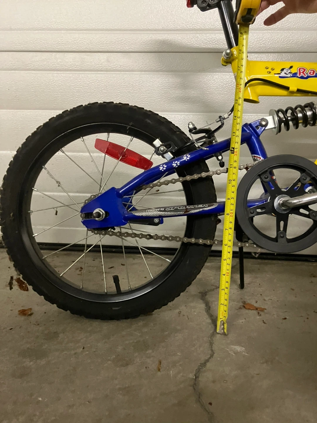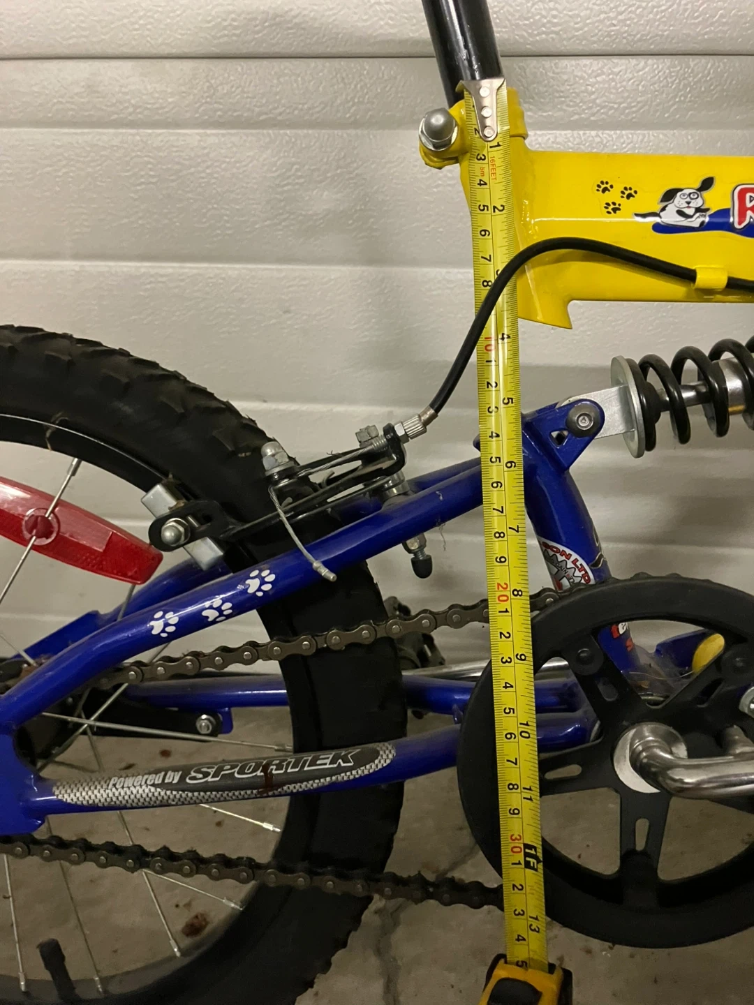 A yellow Sportek kids' bike with a blue frame. It has front suspension and a padded seat. Suitable for young riders!