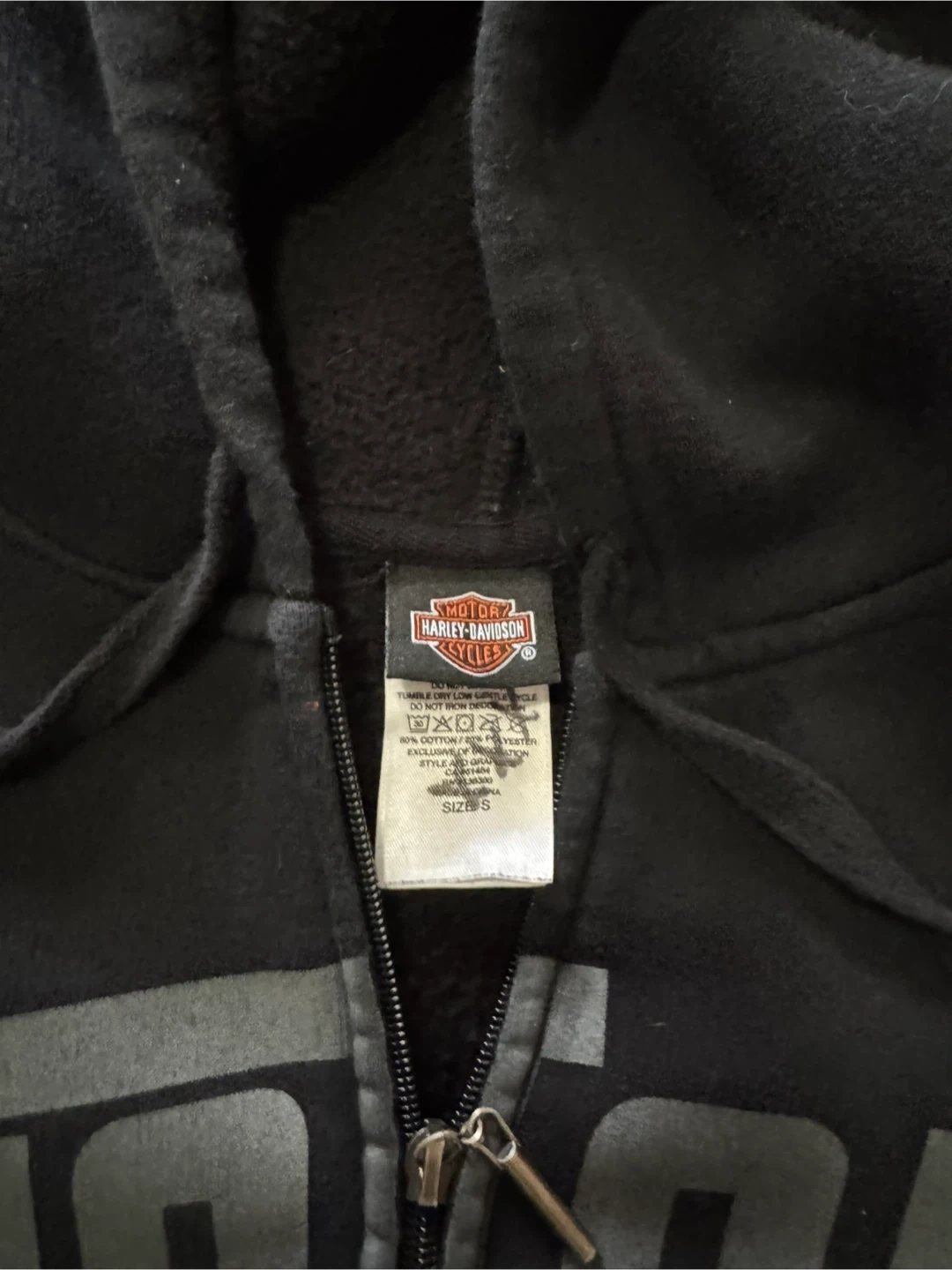 This black Harley-Davidson zip-up hoodie is designed for motorcycle enthusiasts. It features the iconic 'Motor Cycles' graphic on the front. Made from comfortable material, it's perfect for cooler weather or casual wear.