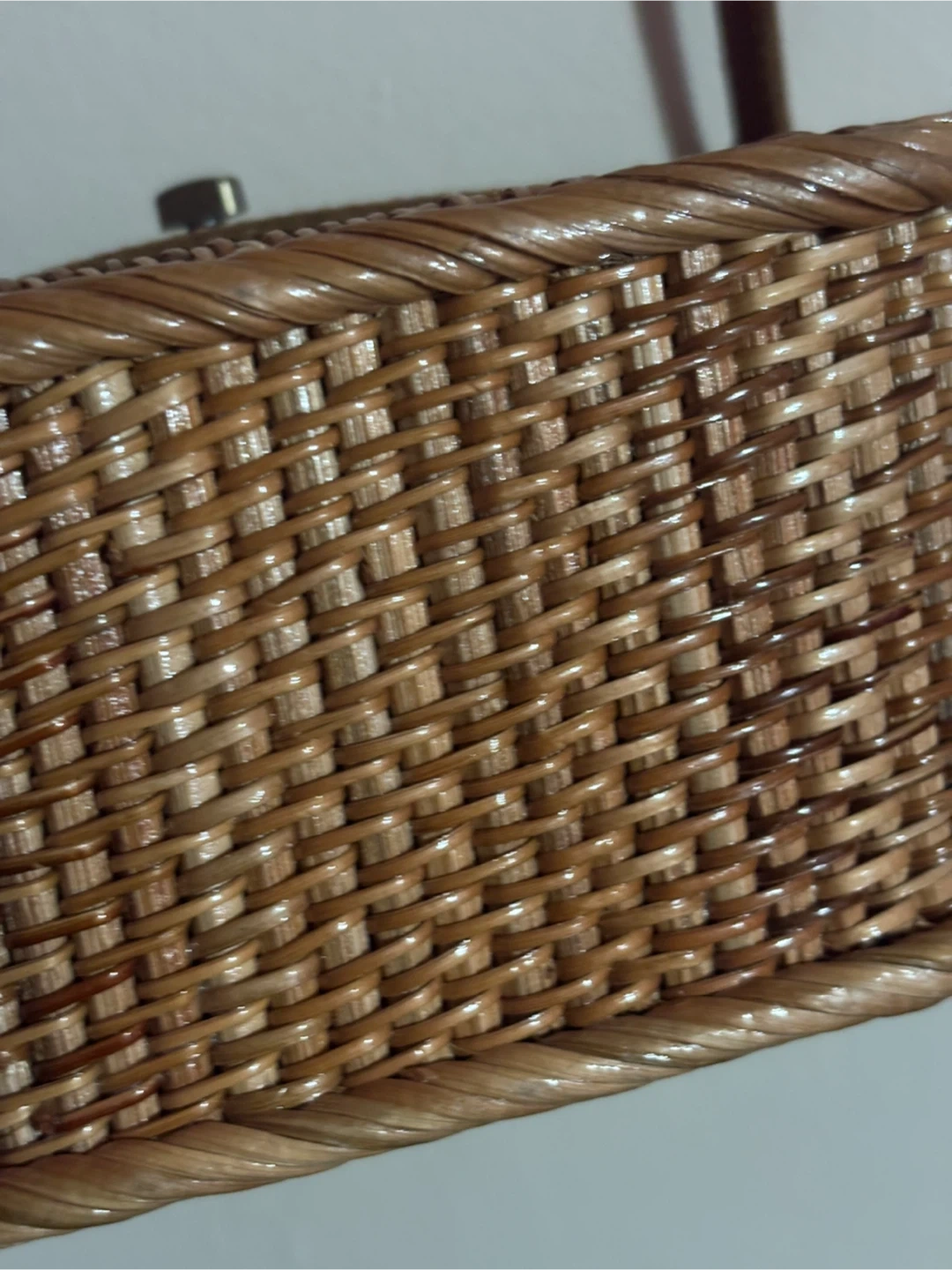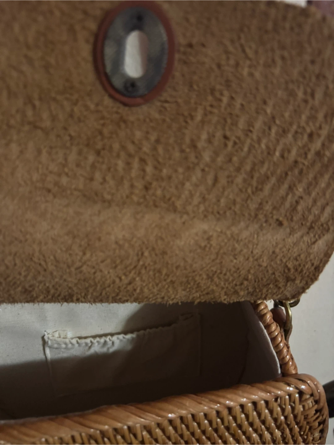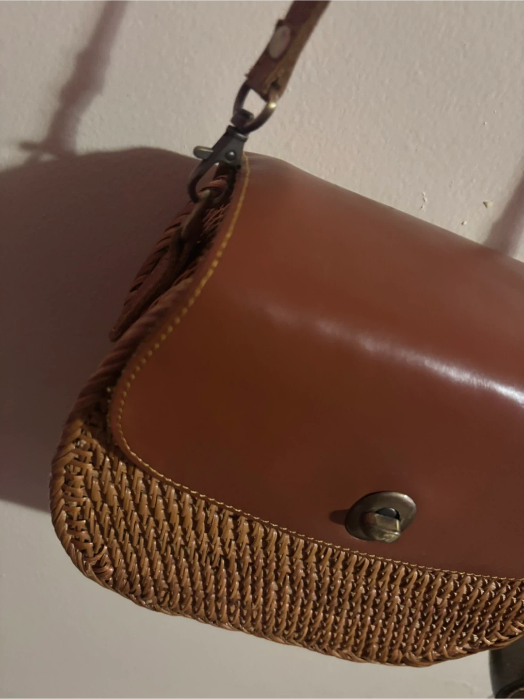 Selling a cute crossbody bag! It features a woven rattan body with a leather flap and strap. The bag is in great condition and perfect for adding a touch of natural style to any outfit