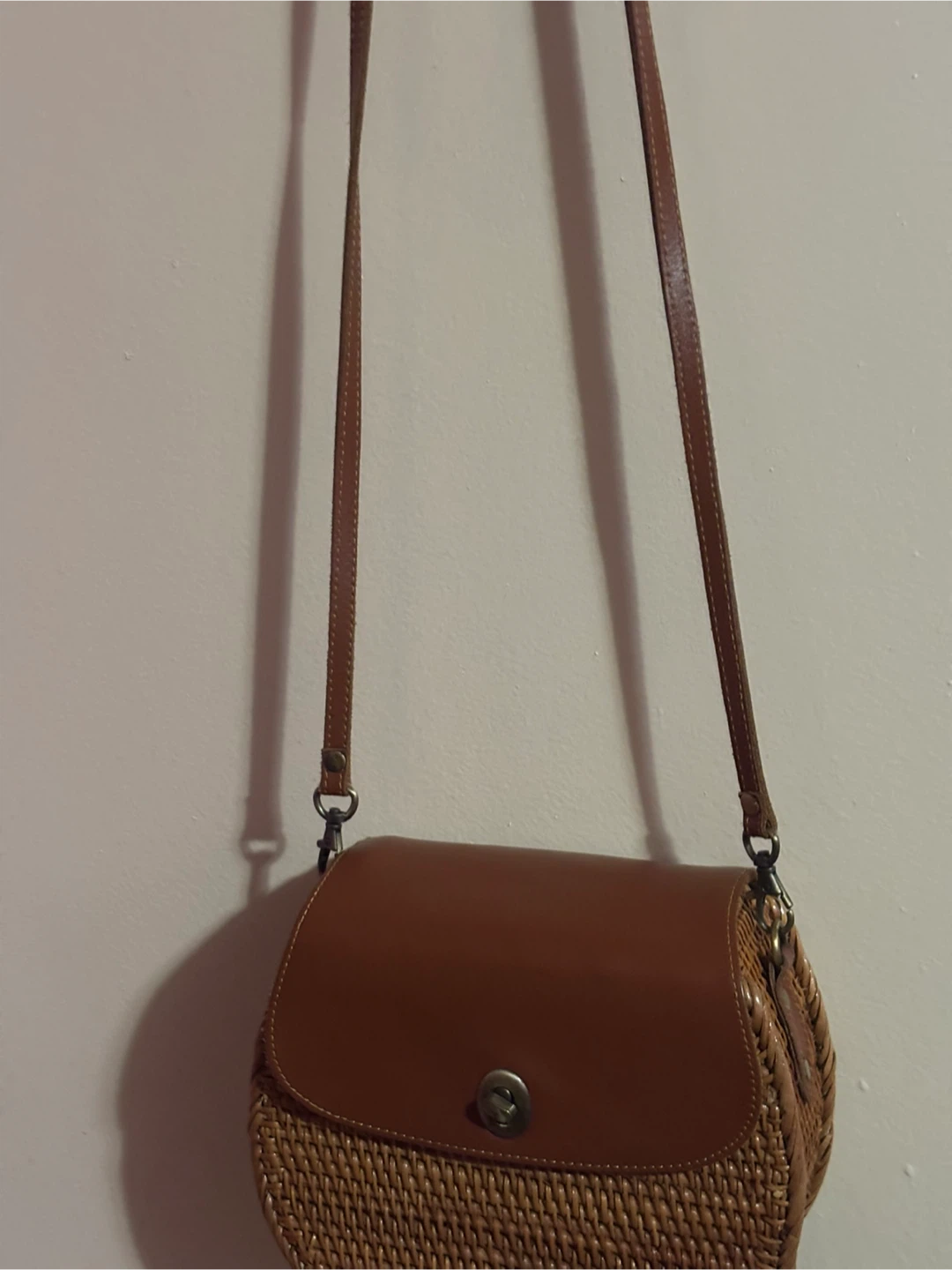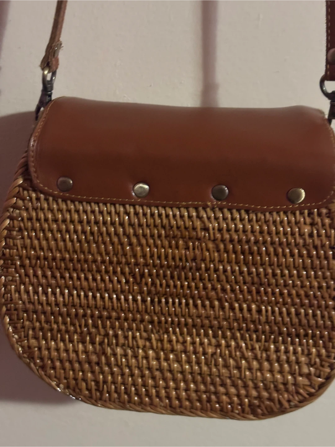 Selling a cute crossbody bag! It features a woven rattan body with a leather flap and strap. The bag is in great condition and perfect for adding a touch of natural style to any outfit