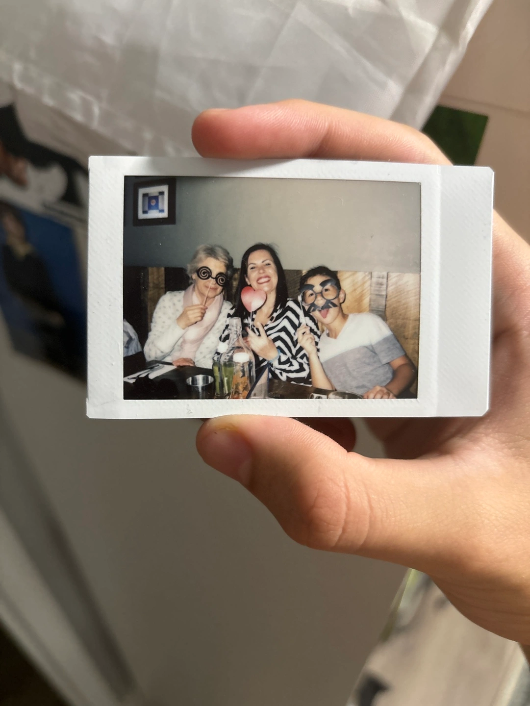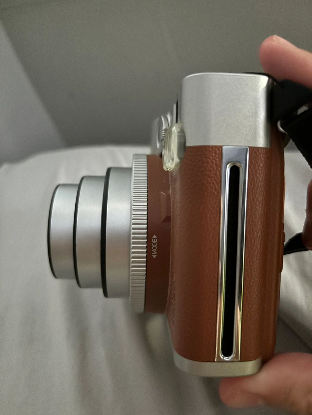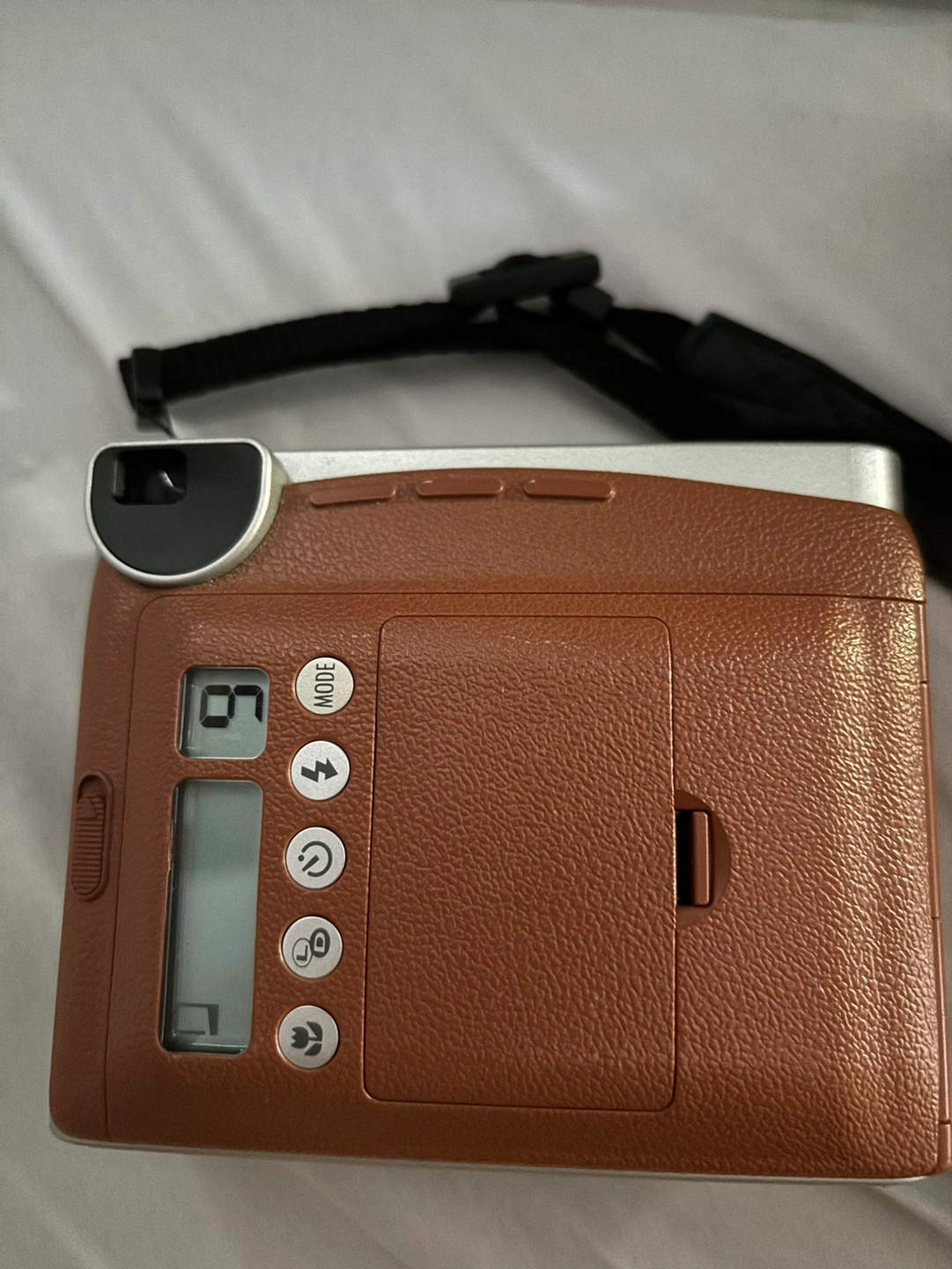 Takes high quality Polaroid pictures. This camera comes with a strap, and takes Instax Mini film. It's a great camera for taking photos with friends and family!