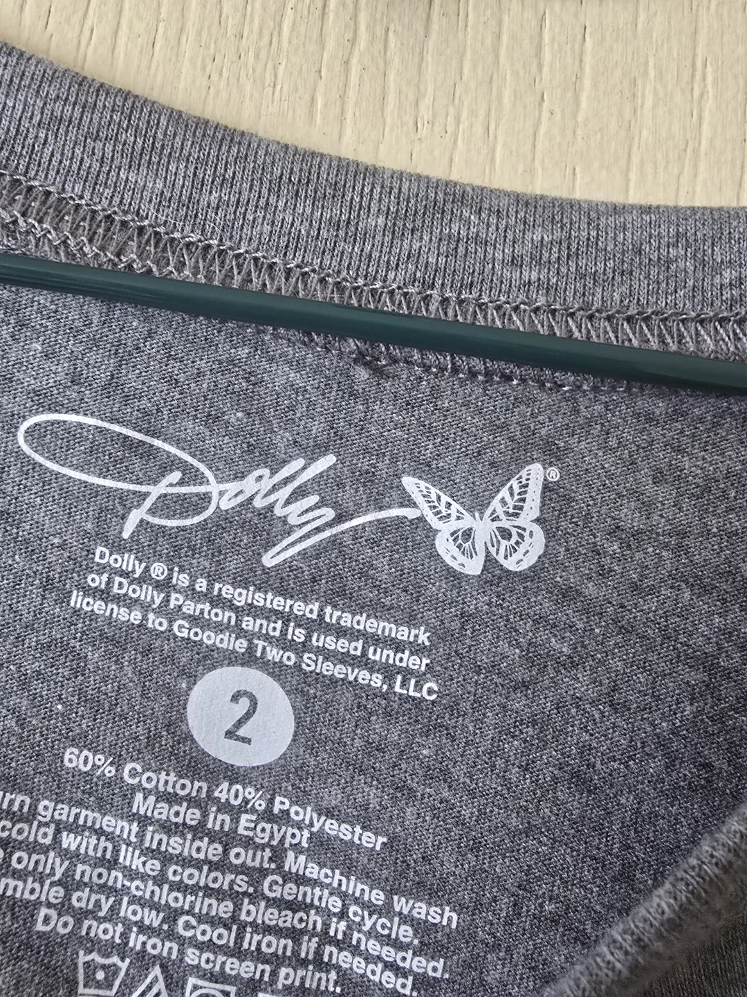Grey t-shirt with Dolly Parton graphic. It's a size 2, made of 60% cotton and 40% polyester. Machine wash cold inside out. New without tags.