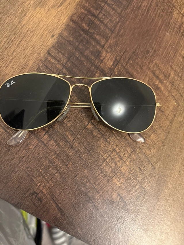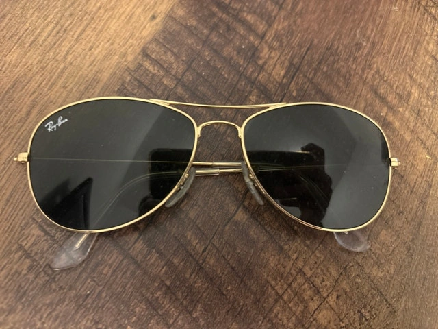 These classic Ray-Ban Aviator sunglasses feature a gold frame and dark lenses, perfect for adding a touch of cool to any outfit. The sunglasses are in used condition, showing some signs of wear, but are still stylish and functional. Elevate your look with these iconic shades! Similar models are listed on Kijiji for between $75 and $150. They're just waiting for someone to give them a new lease on life! Remember, if the ad is up, they're available for grabs! Condition: Used - Good. Cash accepted.