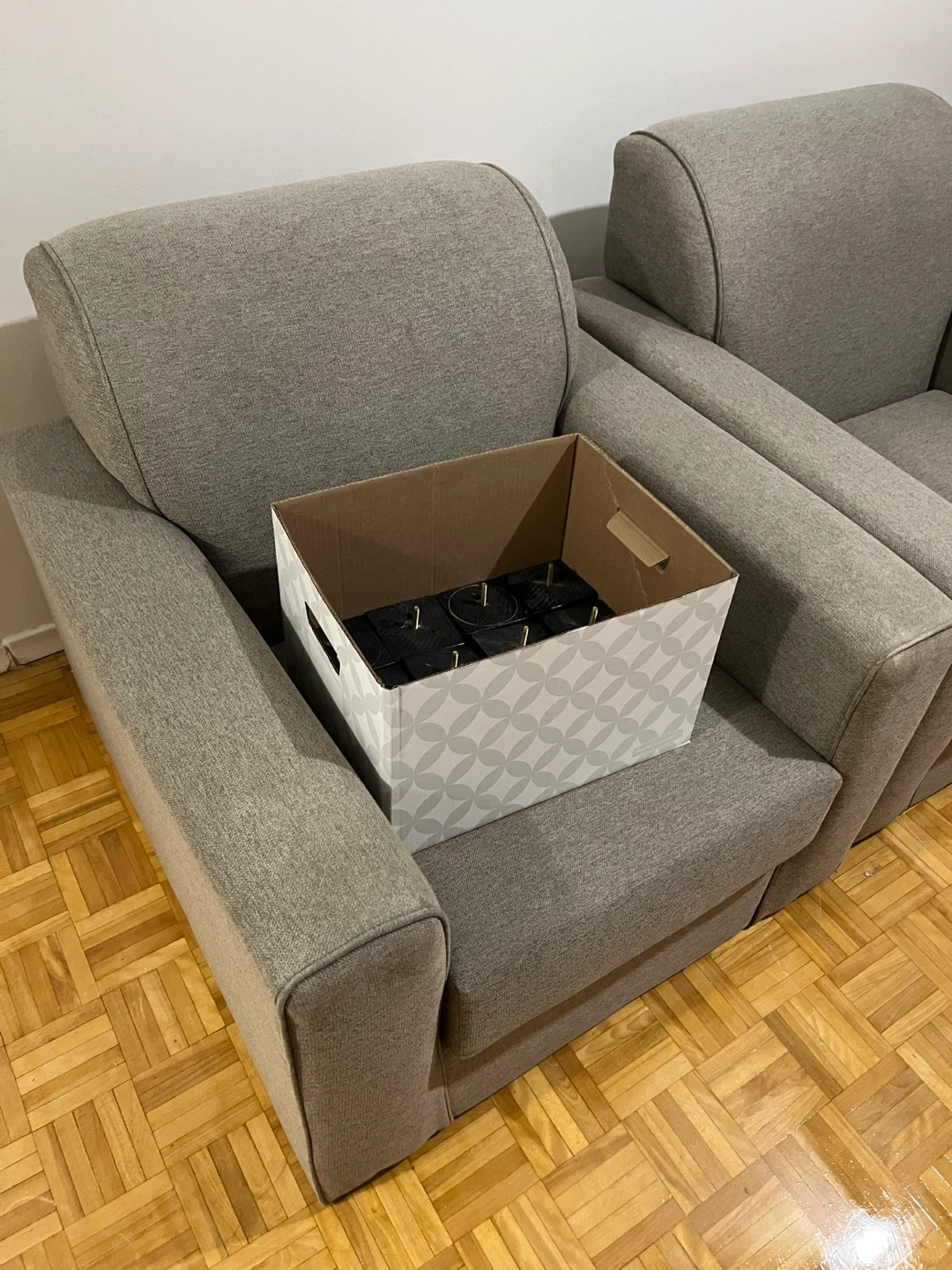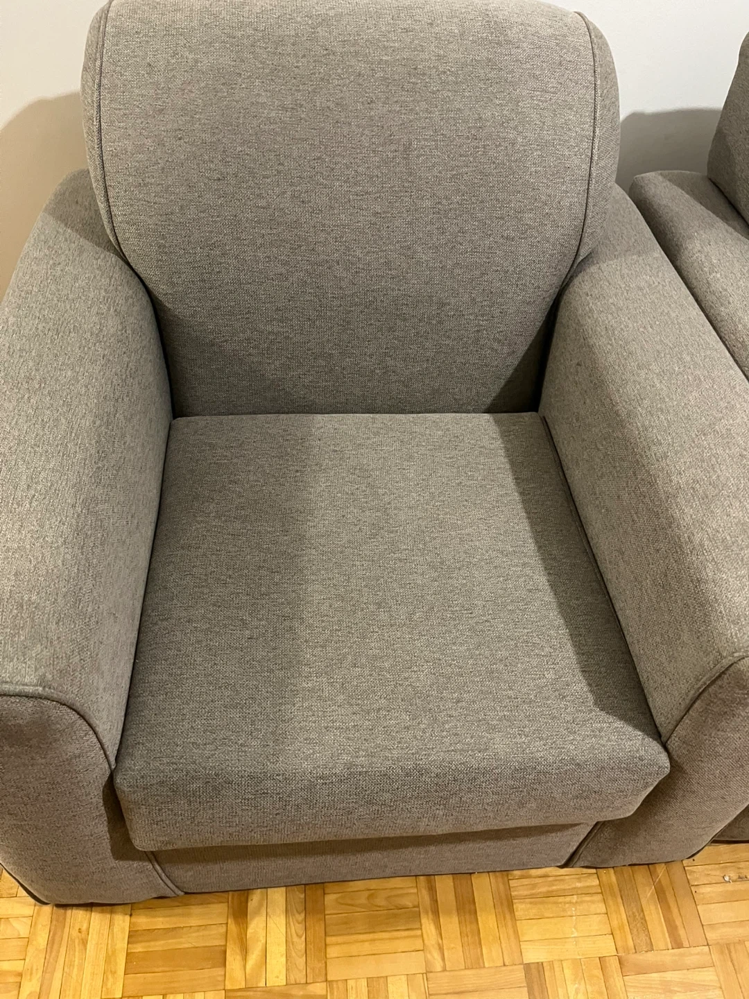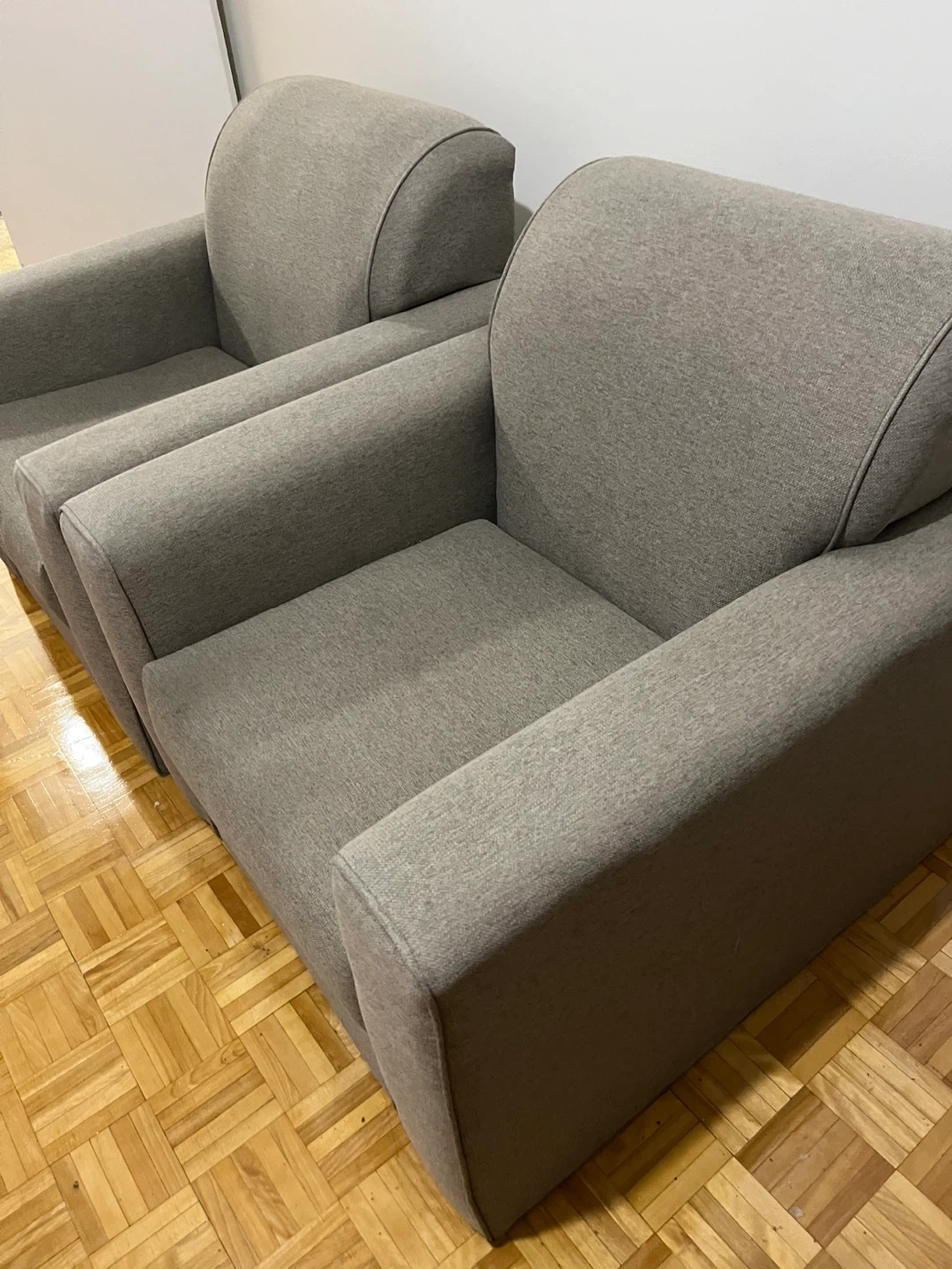 Two comfortable grey fabric armchairs are available. They come with a set of eight black wooden legs, still in the box. These chairs are perfect for adding extra seating to your living room or den. the foot is seperated but overall it’s in good condition. $60 each $100 for two.