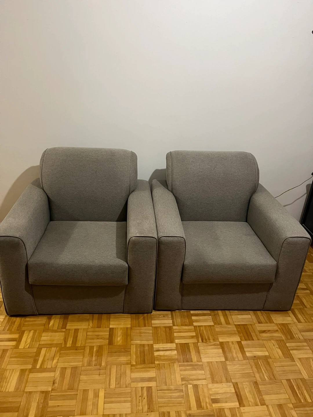 Two comfortable grey fabric armchairs are available. They come with a set of eight black wooden legs, still in the box. These chairs are perfect for adding extra seating to your living room or den. the foot is seperated but overall it’s in good condition. $60 each $100 for two.