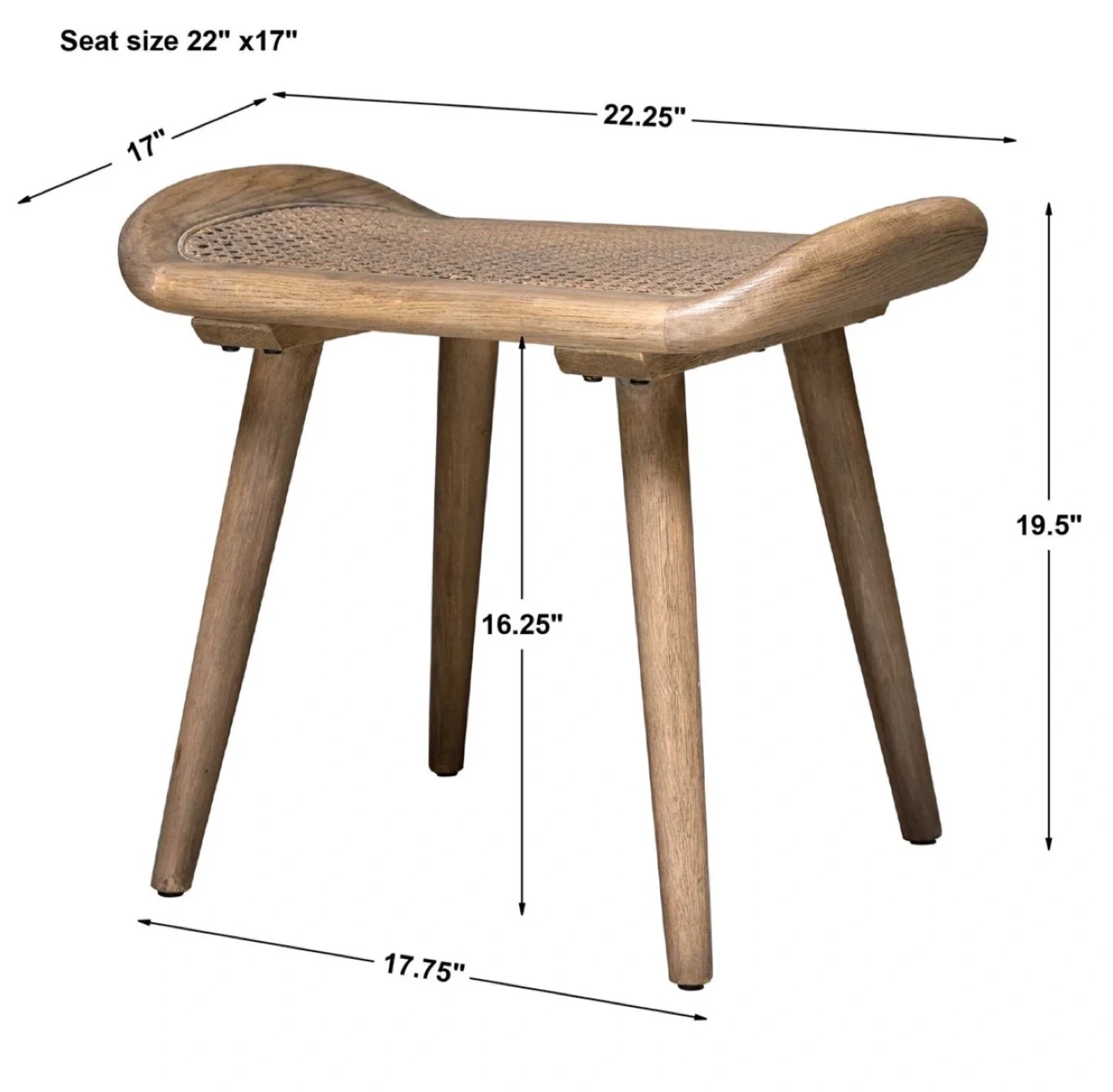 Selling a stylish accent stool from Uttermost! It features a wood frame with a woven rattan seat. The seat size is 22" x 17". Comes in the original box, ready for easy transport