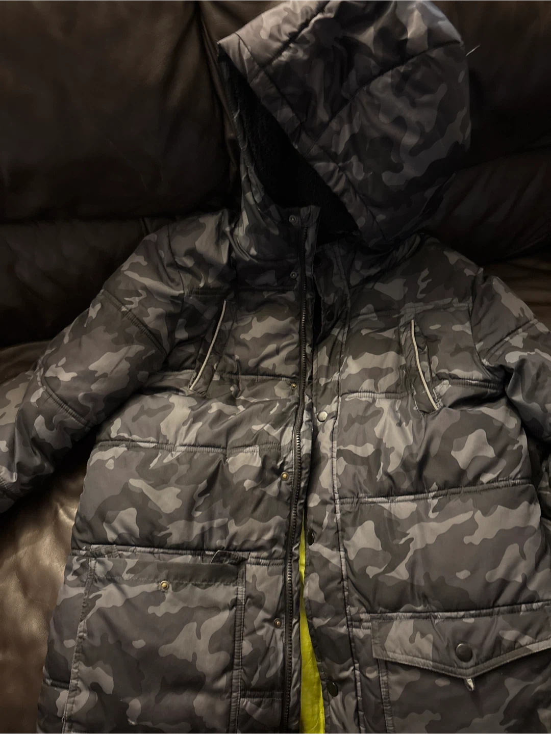 Here's a warm and stylish camo puffer jacket! It's perfect for those chilly days and has a cool, modern look. The jacket is in good condition and ready for a new owner