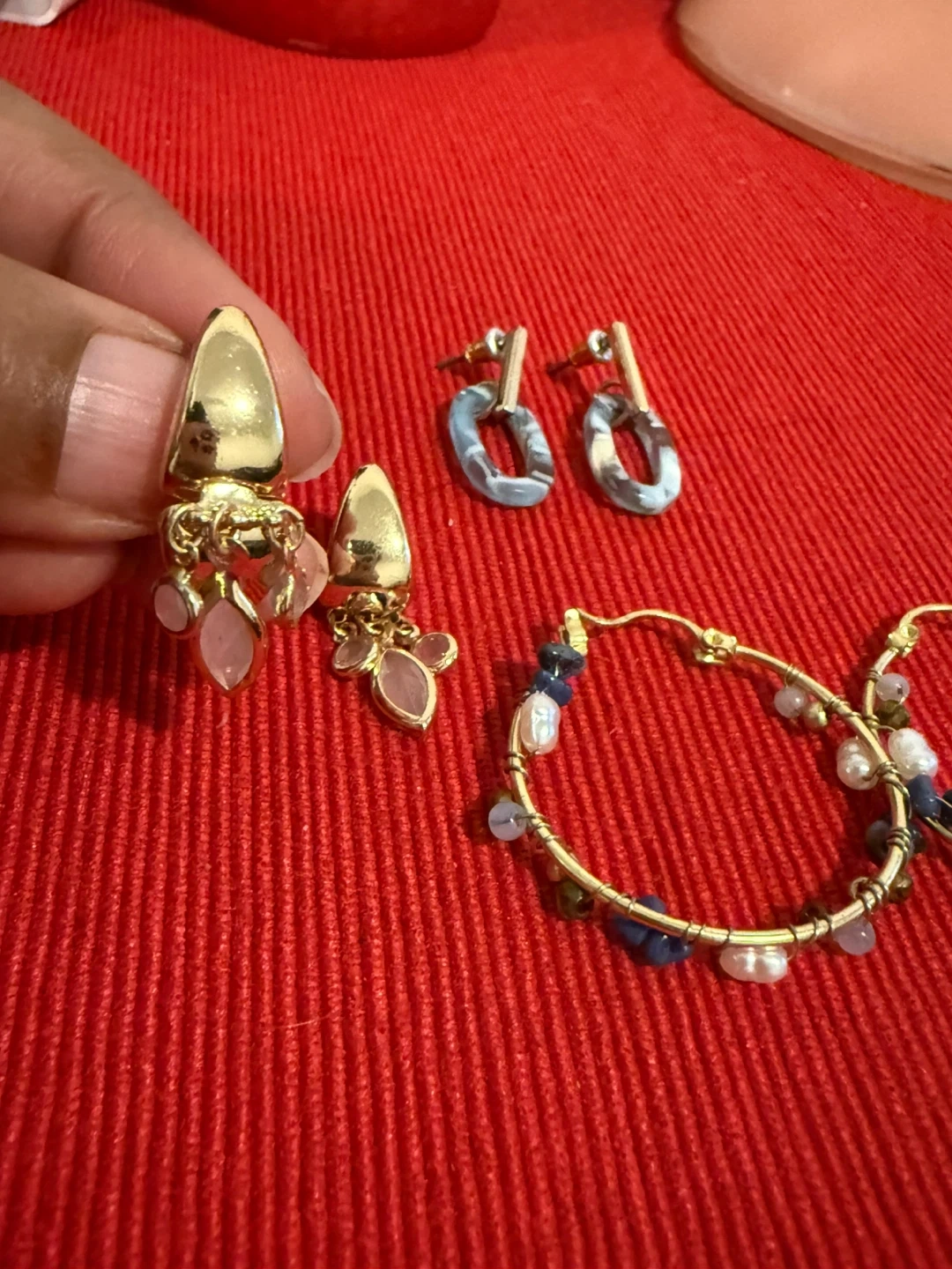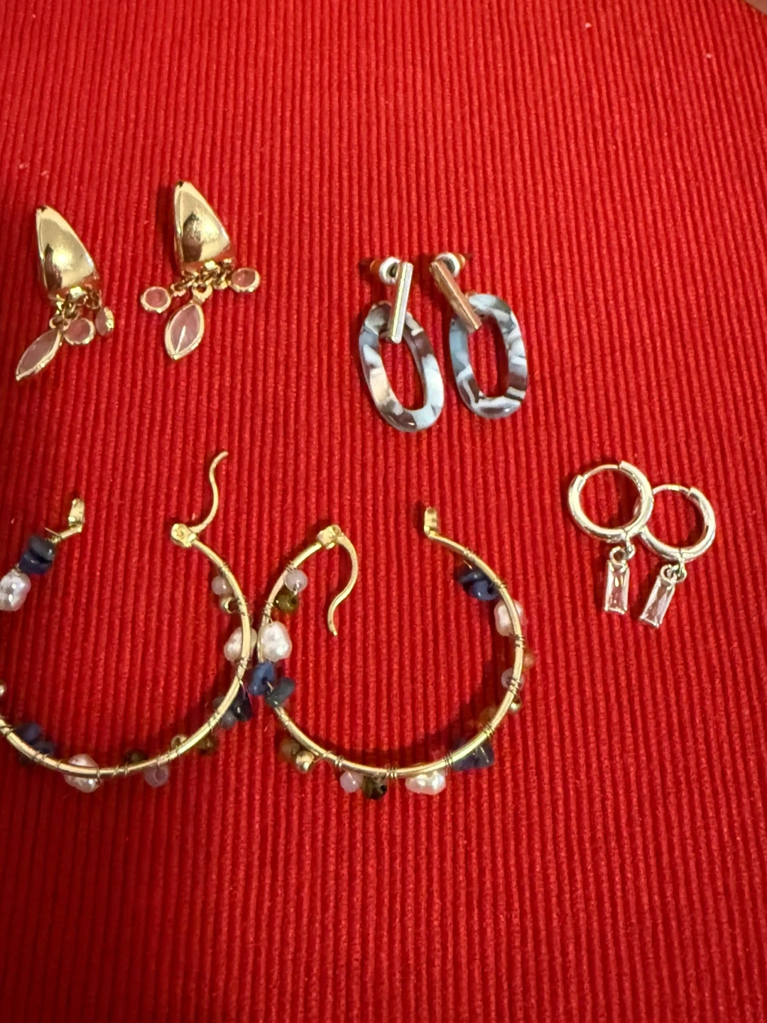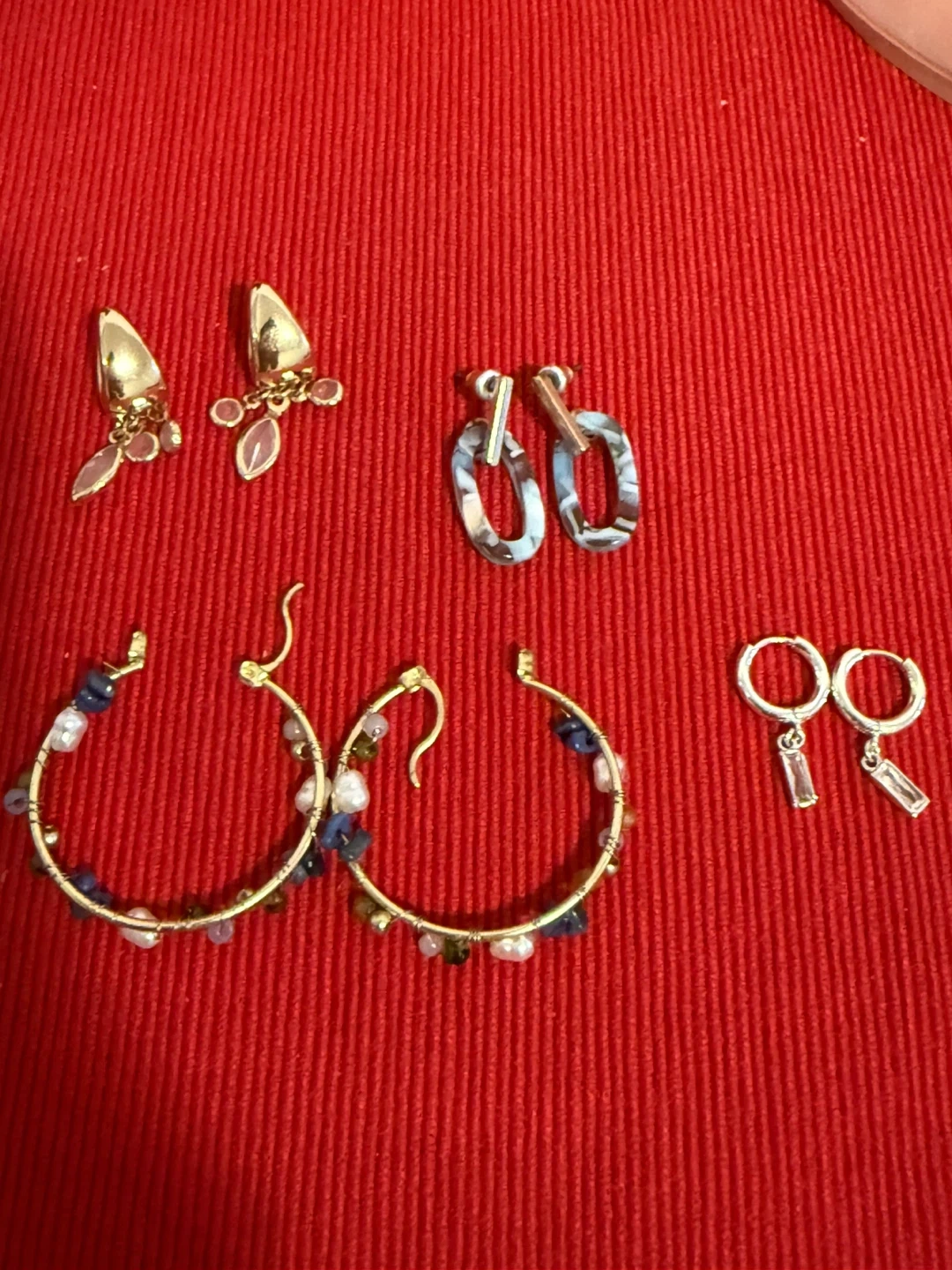 Selling a set of earrings, including gold-tone drop earrings with pink accents, blue and white patterned earrings, gold hoop earrings with pearl and coloured bead details, and small silver hoop earrings with crystal . Two of them are brand new, haven’t worn. These are from Gap, and Aldo! Got each for around $ 20-30s. Perfect for daily work wear.