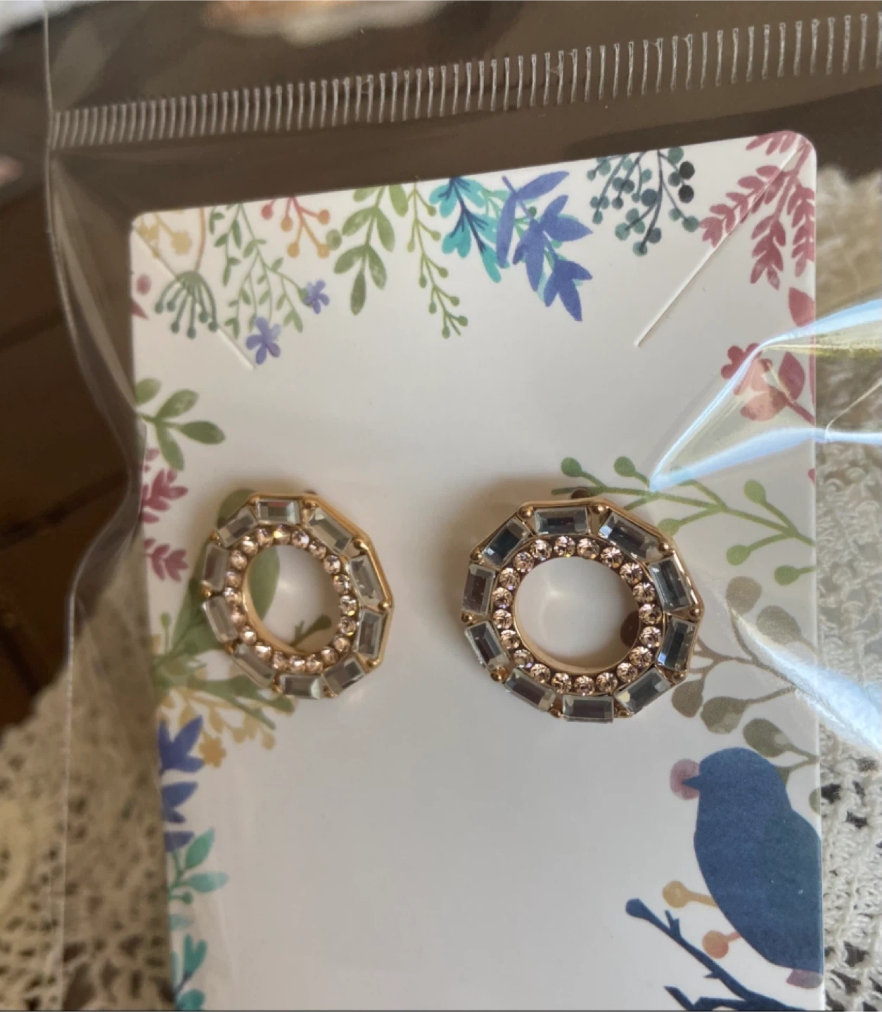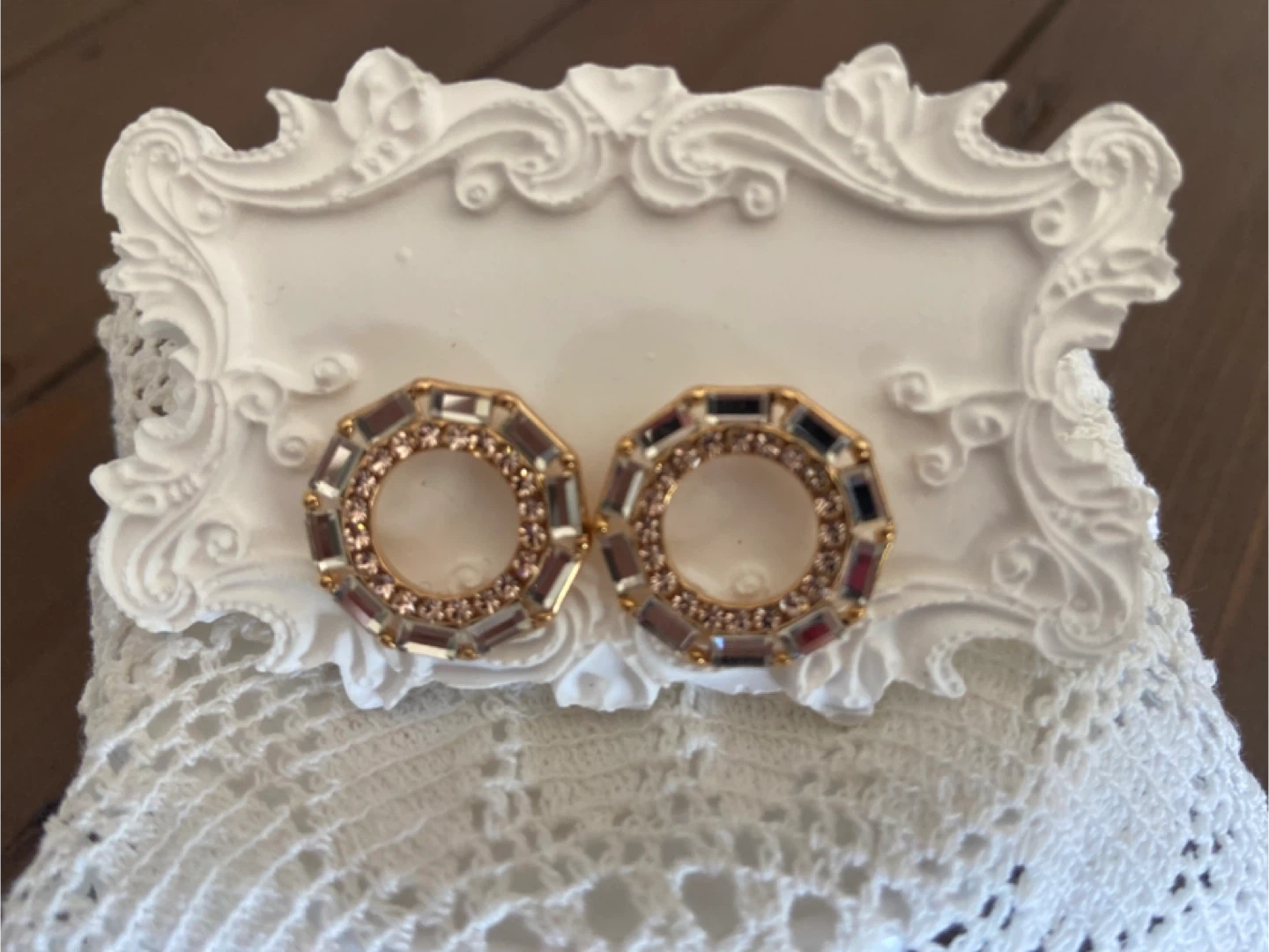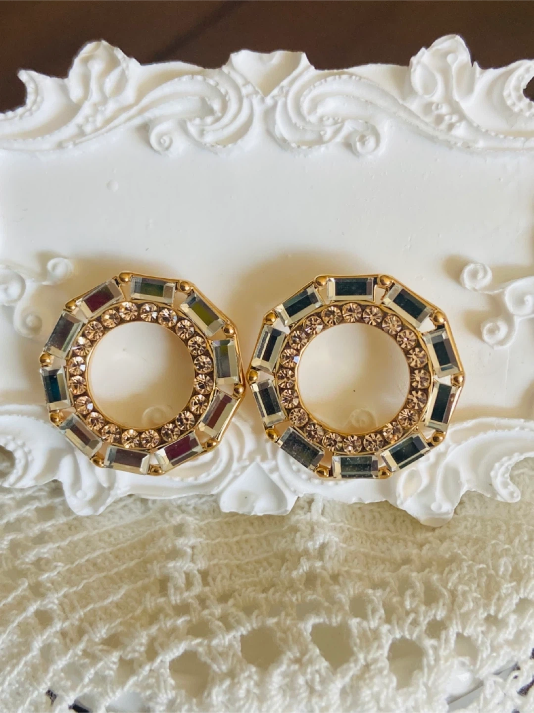 10These earrings feature a gold-tone setting with gem accents around the perimeter. They have an octagonal shape with a circular centre, giving them a unique and elegant look. Perfect for adding a touch of sparkle to any outfit!