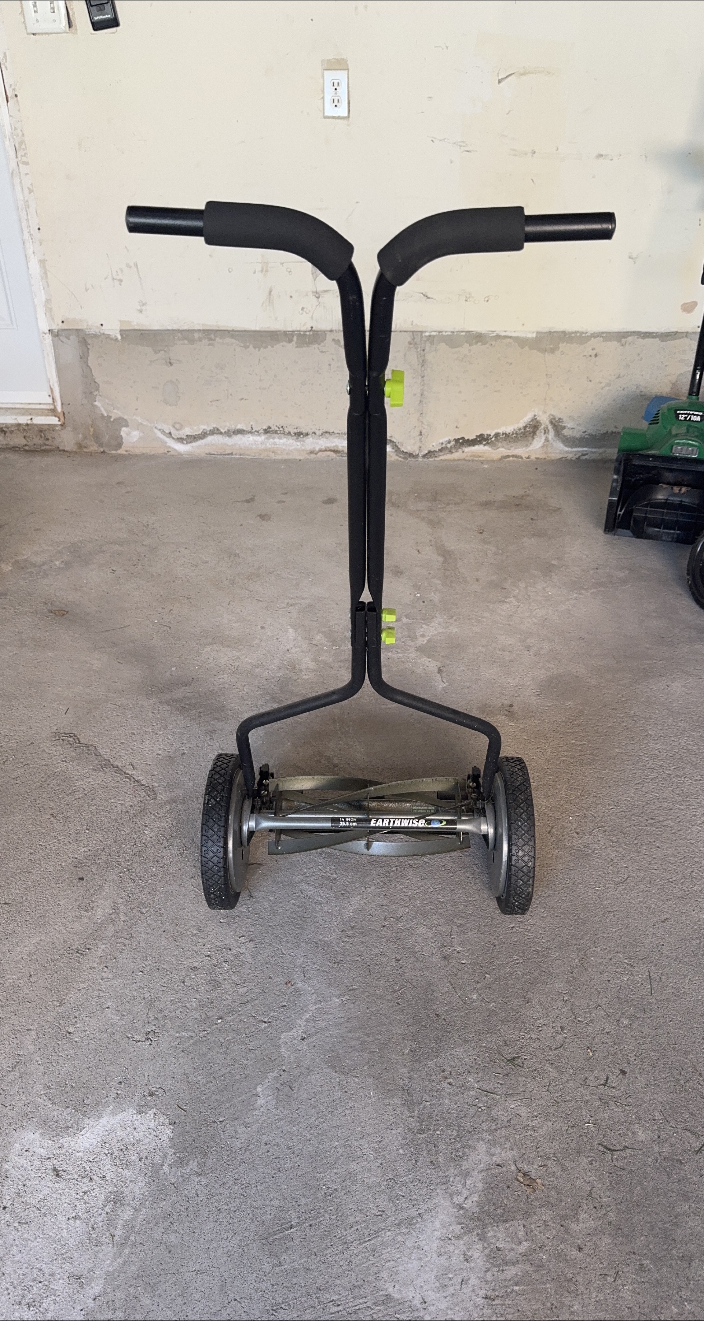 64A manual lawn mower with a handle and two wheels. The handle has a soft grip, and the body is black. Perfect for some light yard work. 14”.
