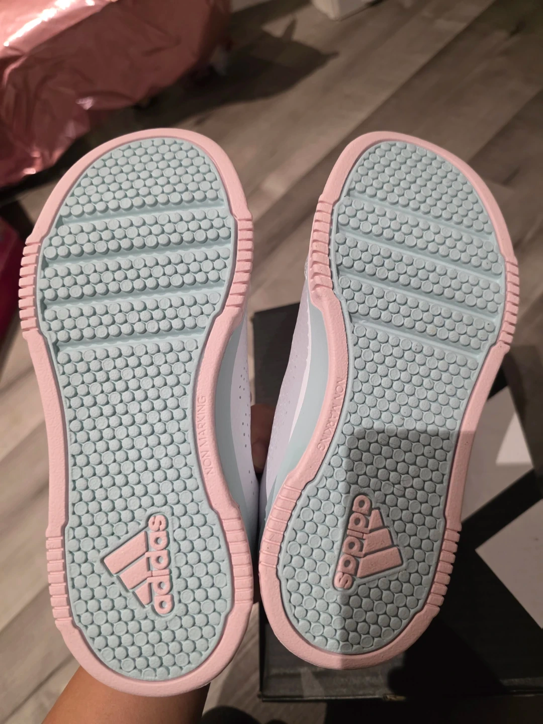Selling a pair of Adidas Tensaur Sport 2.0 K sneakers in white and pink. They are a kids size 2 and come with the original box