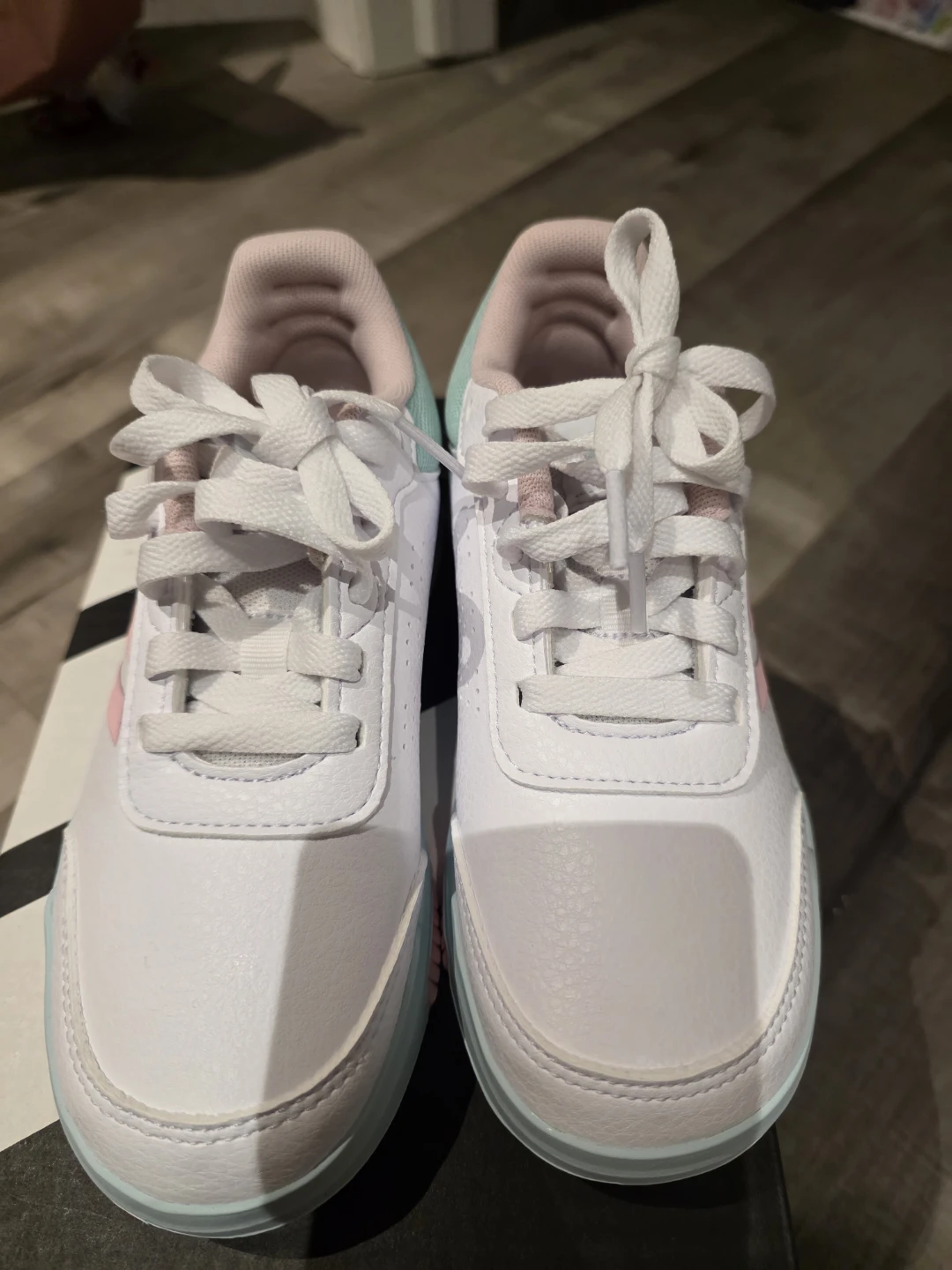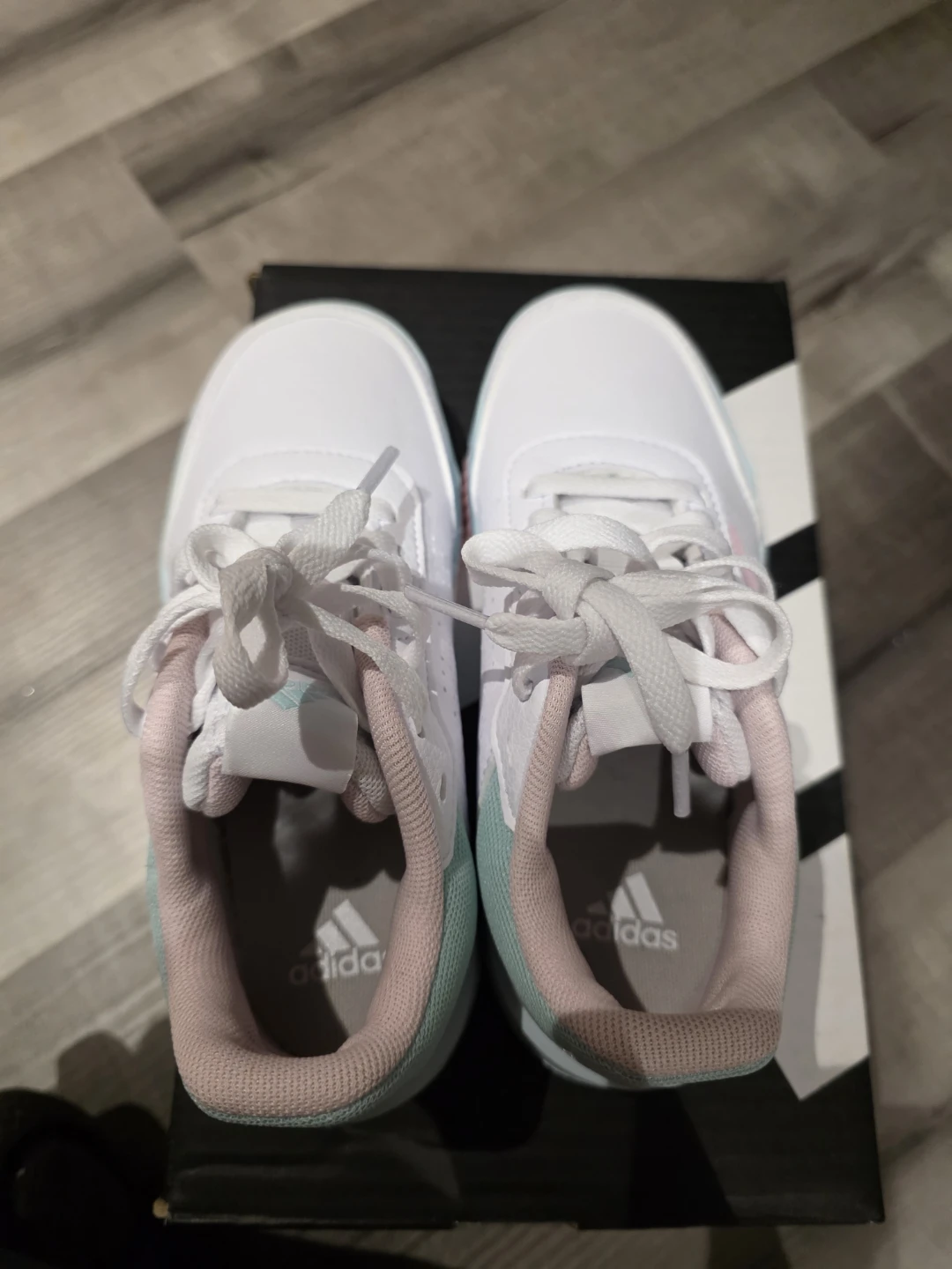 Selling a pair of Adidas Tensaur Sport 2.0 K sneakers in white and pink. They are a kids size 2 and come with the original box