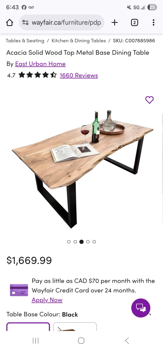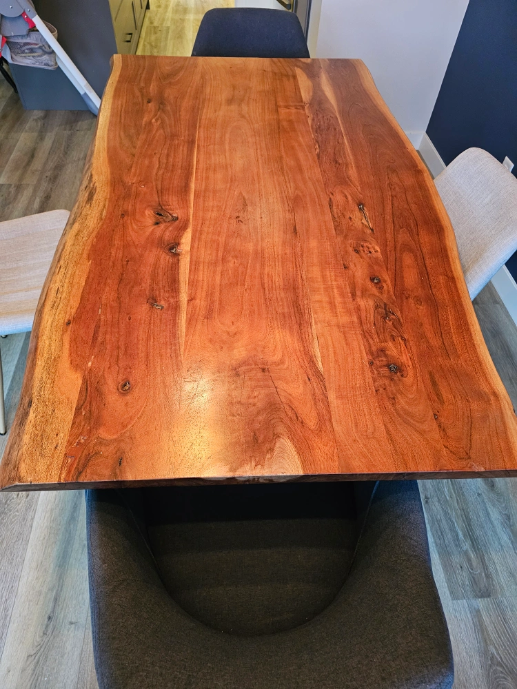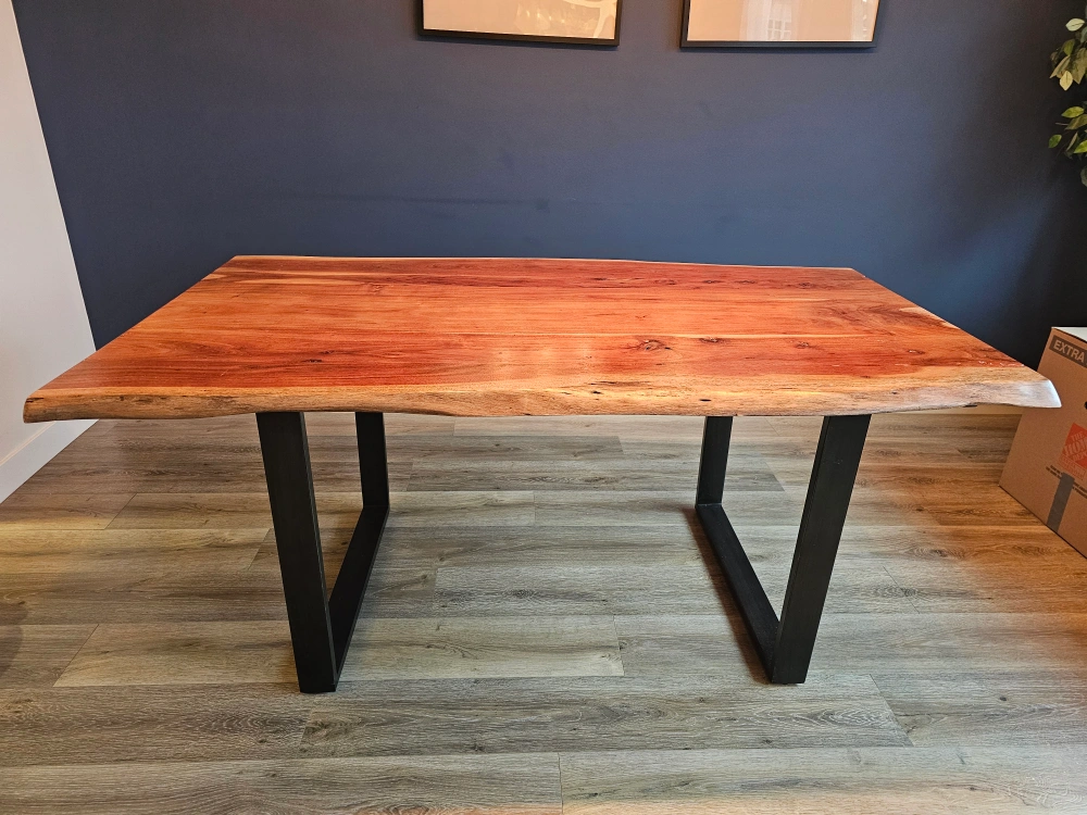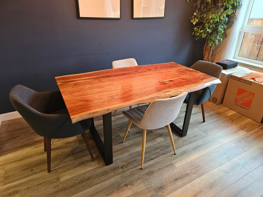 60Selling a beautiful Acacia Solid Wood Top Metal Base Dining Table by East Urban Home. It features a unique live edge and sturdy metal base. Originally bought for $1,669.99