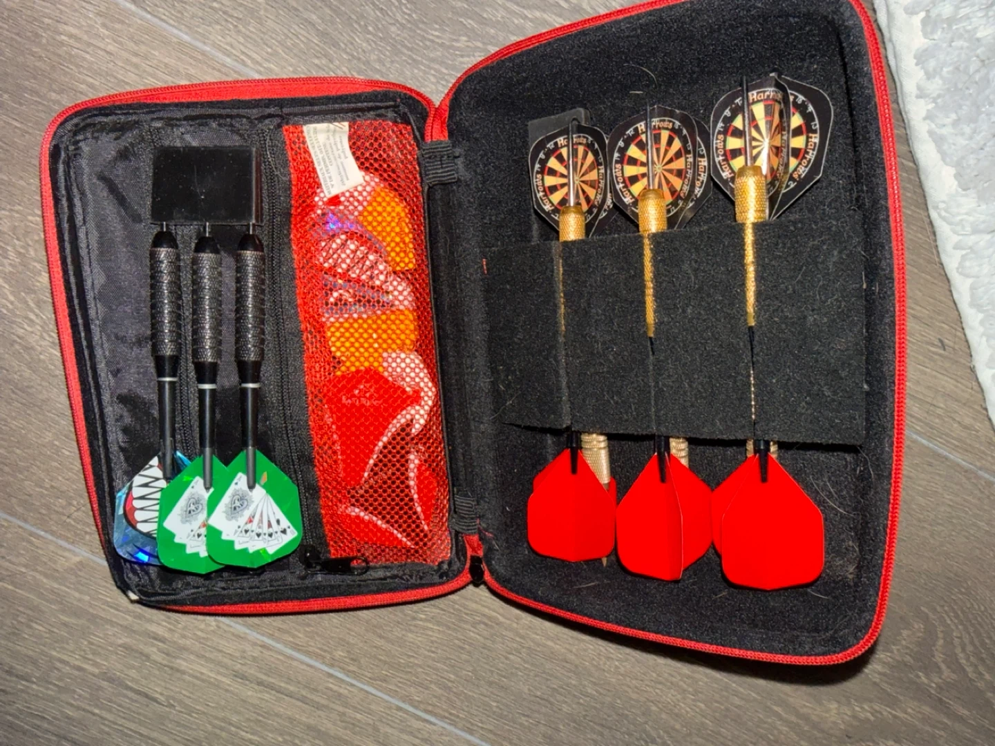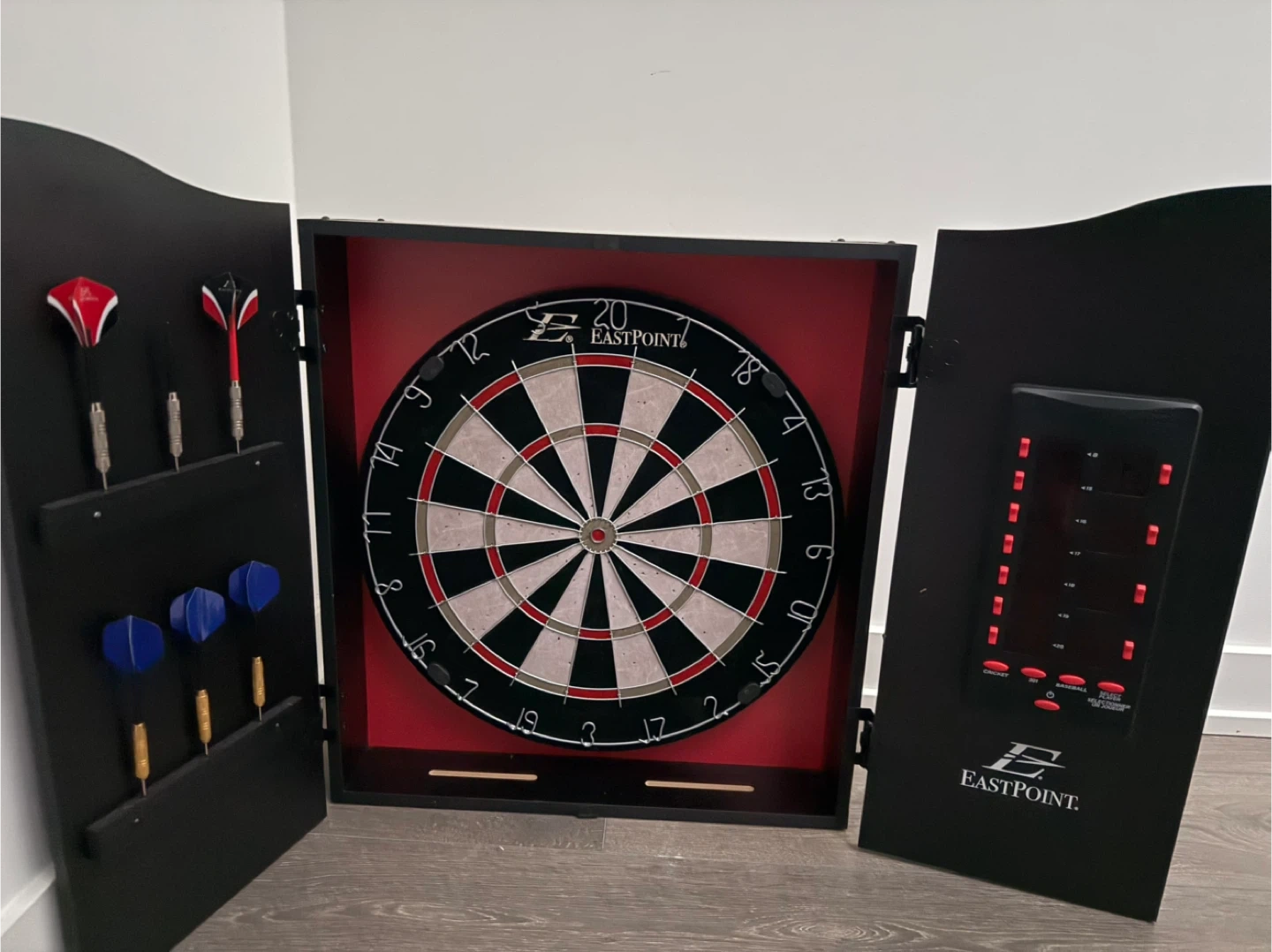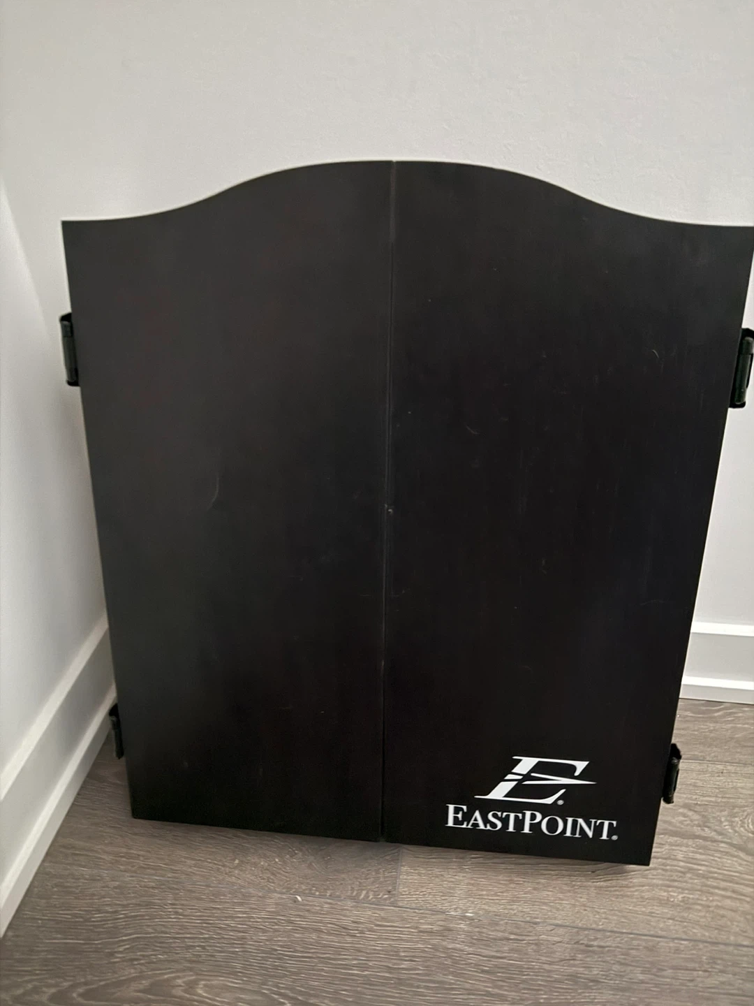 59Selling an EastPoint dart board set, complete with a cabinet and multiple sets of darts. It's in great shape and ready for some fun games!