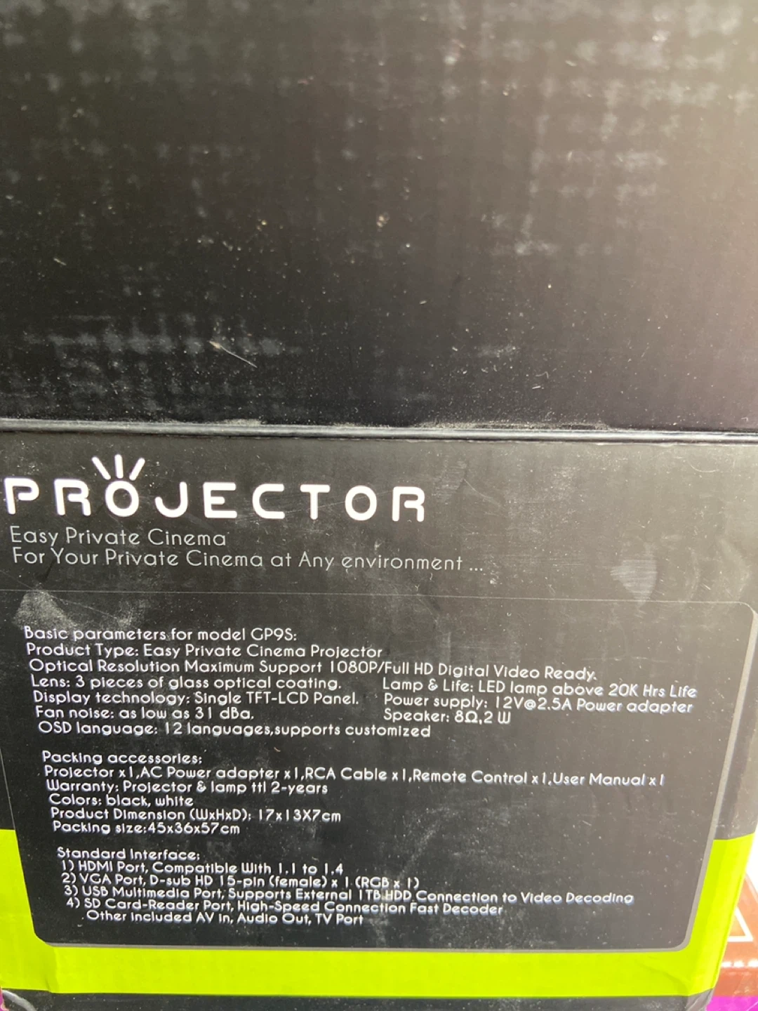 Selling an Easy Private Cinema Projector, model GP9S. It supports maximum 1080P/Full HD Digital Video Ready. The lens has 3 pieces of glass optical coating and the lamp is an LED lamp above 20K Hrs Life. It includes: - Projector x 1 - AC Power adapter x 1 - RCA Cable x 1 - Remote Control x 1 - User Manual x 1 Warranty: Projector & lamp 1+1 = 2 years Colours: black & white Product Dimension (WxHxD): 17x13x7cm Speaker: 8Ω,2 W 25 or best offer