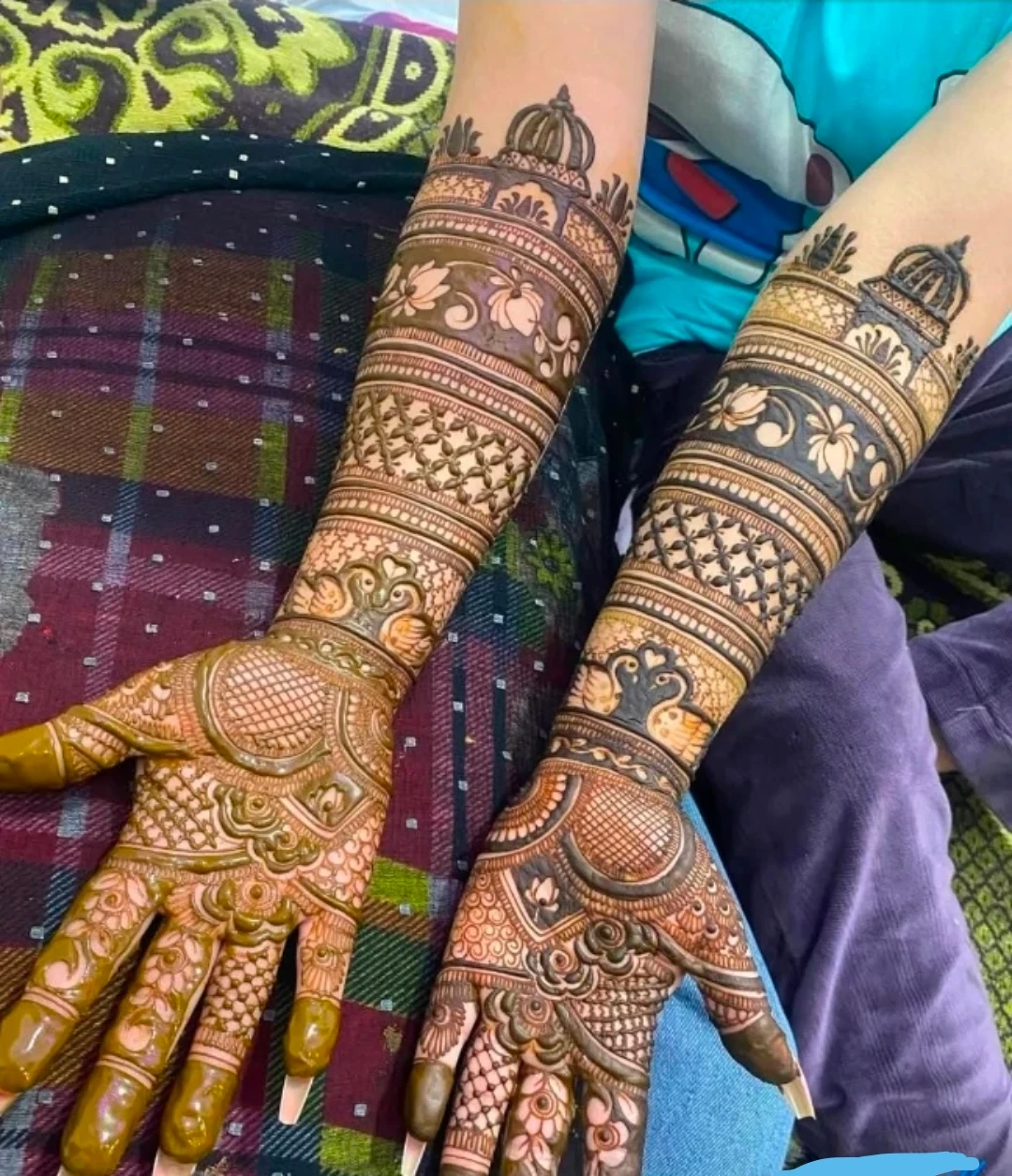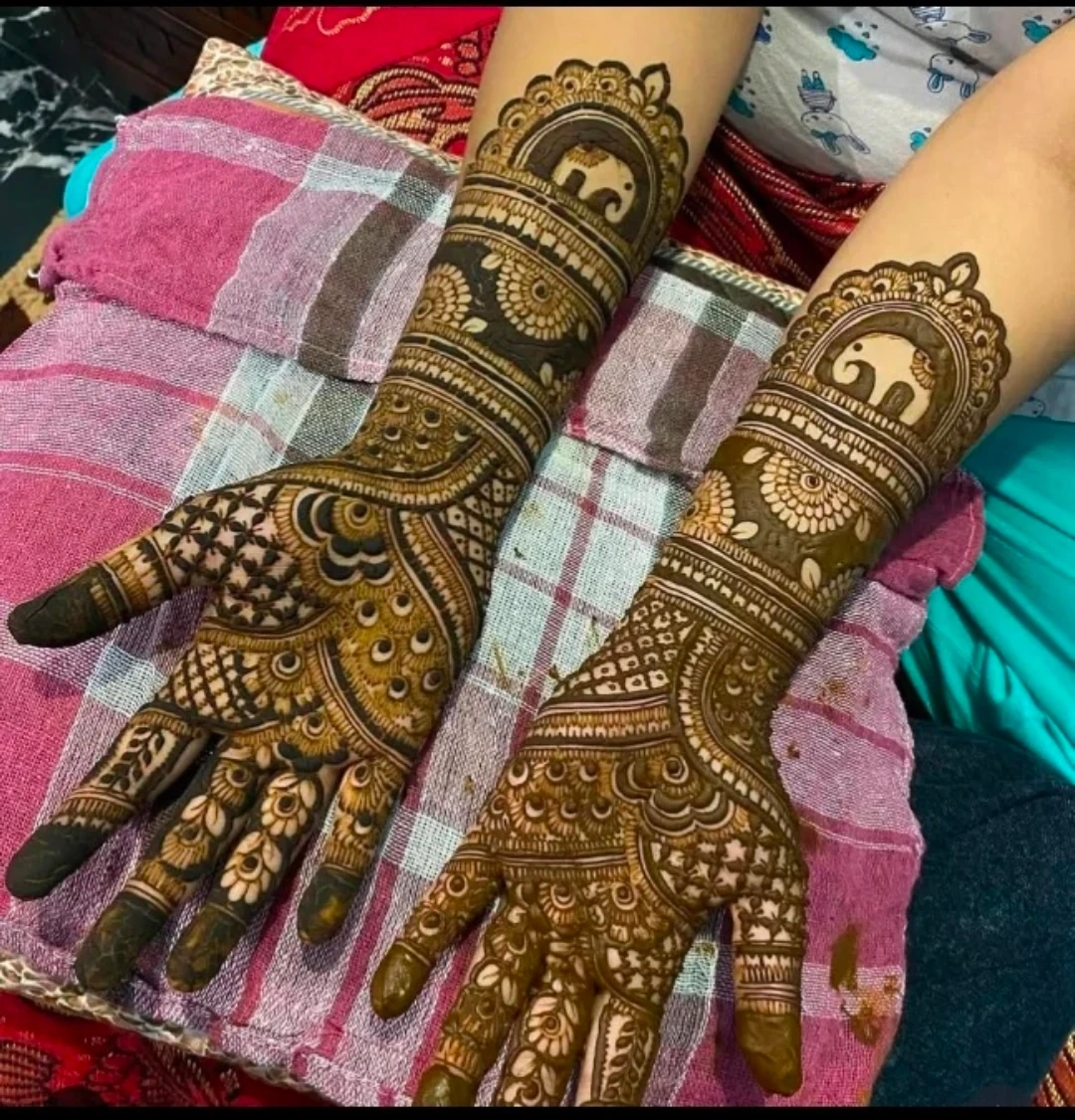 Beautifully intricate henna mehendi designs applied to arms and hands. Detailed patterns include floral motifs, peacocks, and elephants. These designs are perfect for special occasions and celebrations.
