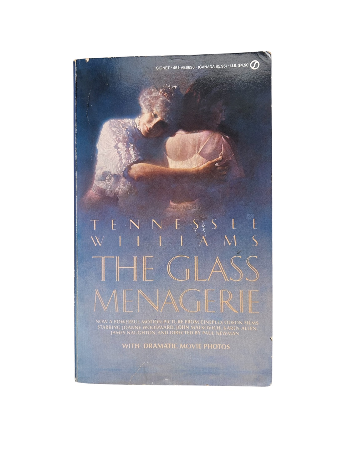 Selling a copy of "The Glass Menagerie" by Tennessee Williams! It's a Signet edition. This edition includes dramatic movie photos from the Cineplex Odeon Films motion picture starring Joanne Woodward, John Malkovich, Karen Allen, James Naughton, and directed by Paul Newman. Free with purchase of $5 or more!