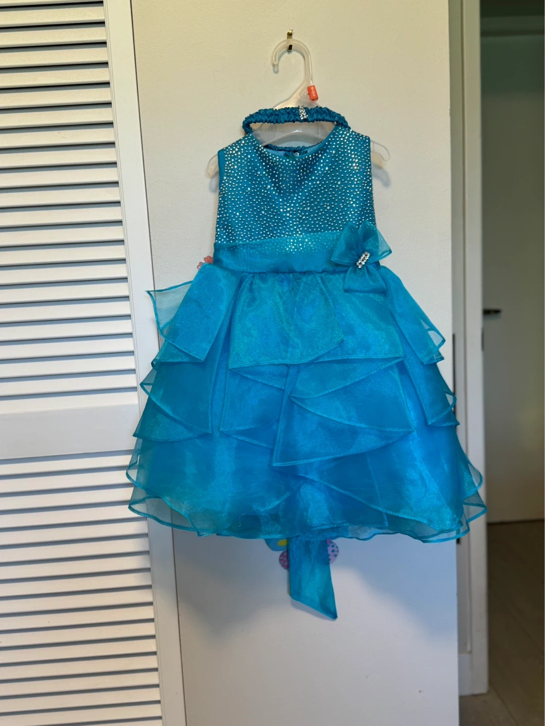 Sparkly turquoise dress with rhinestone detailing on the bodice. It features a layered organza skirt and a bow accent. Perfect for special occasions! Size 24 months