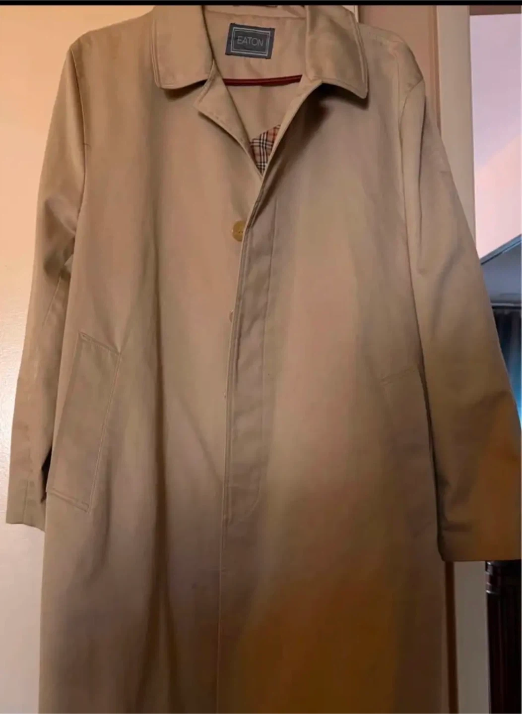 10Classic beige trench coat from Eaton! It's in good condition and ready for a new home. Perfect for those cooler Canadian days and evenings. For men who enjoy streetwear, are perfect for everyday outings and social gatherings, showcasing both personal style and a stylish attitude.Worm once for photos .