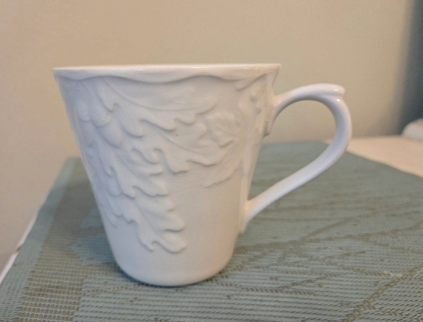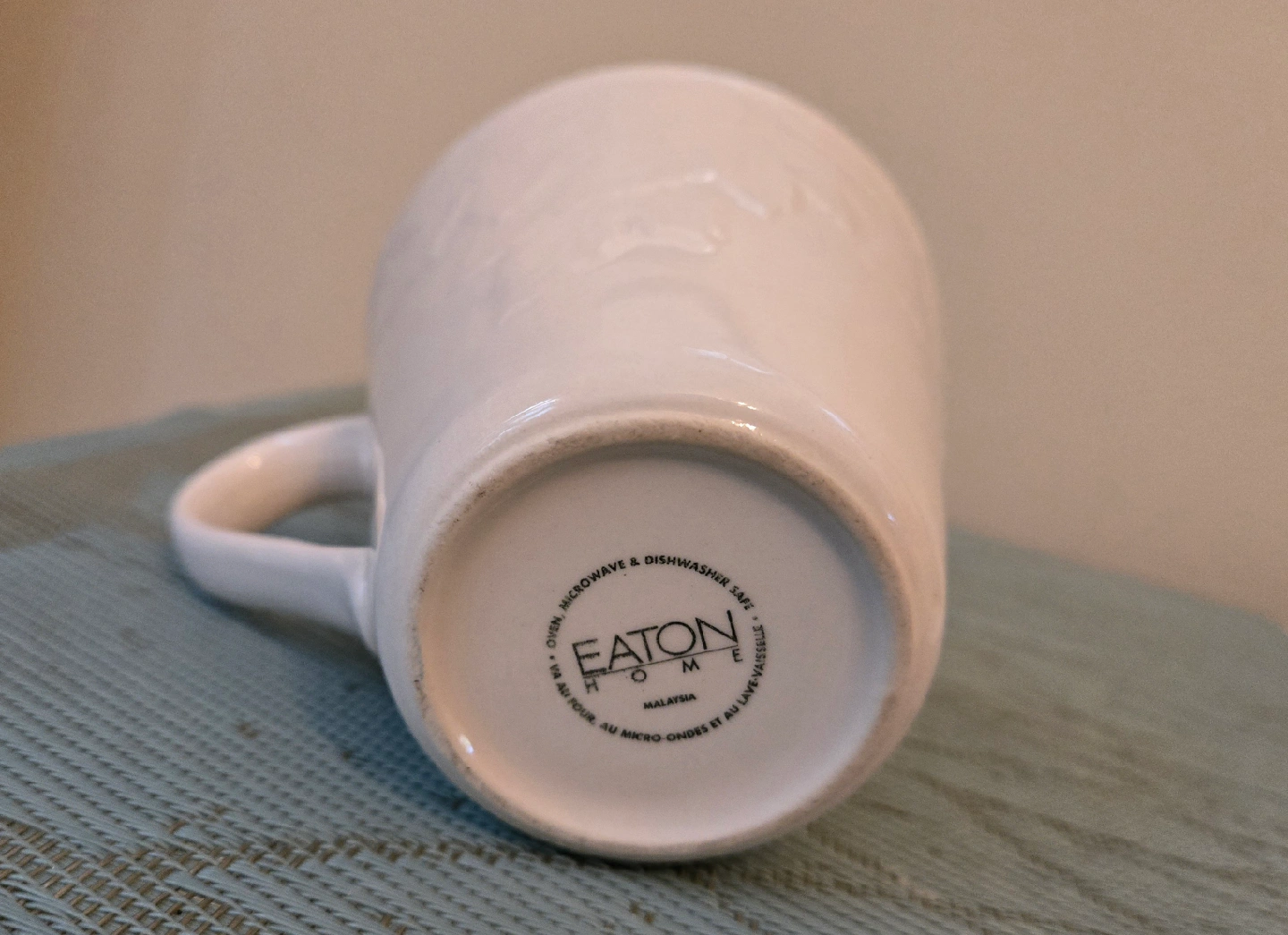 10Selling a white Eaton Home mug. It's microwave and dishwasher safe. The mug has a lovely oak leaf design. Perfect for your morning coffee or tea!