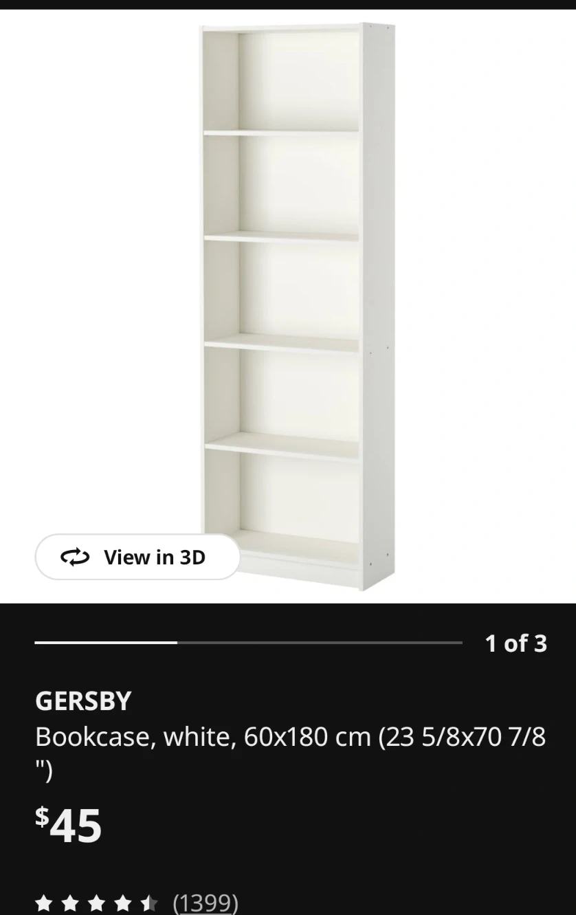 Buy & SellIKEA GERSBY Bookcase - WhiteIKEA GERSBY Bookcase - White$502 White IKEA GERSBY bookcase. It's 60x180 cm (23 5/8x70 7/8 "). 5 shelves for storage. $30 EA or 2 for $50ConditionGoodWHERE TO MEETMarkham, Kennedy and 14th AvenueView MapSELLERNikkiMilliken797 reviews1 chats·5 favorites·22 viewsSEND CHAT TO SELLERHi Nikki! I’m interested in your listing.Hi Nikki! I’m interested in your listing.Get the Karrot app to chatSign In to chat