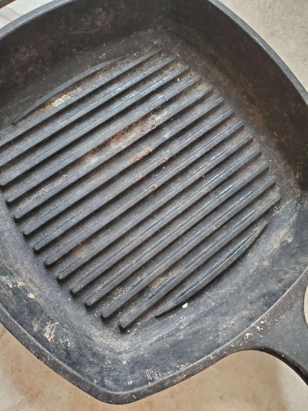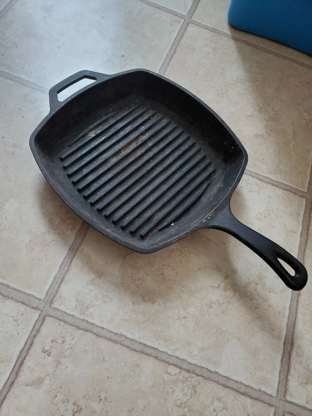 Selling a cast iron grill pan. It's great for grilling indoors and getting those nice grill marks on your food. It has some signs of use, but it's still in good working condition