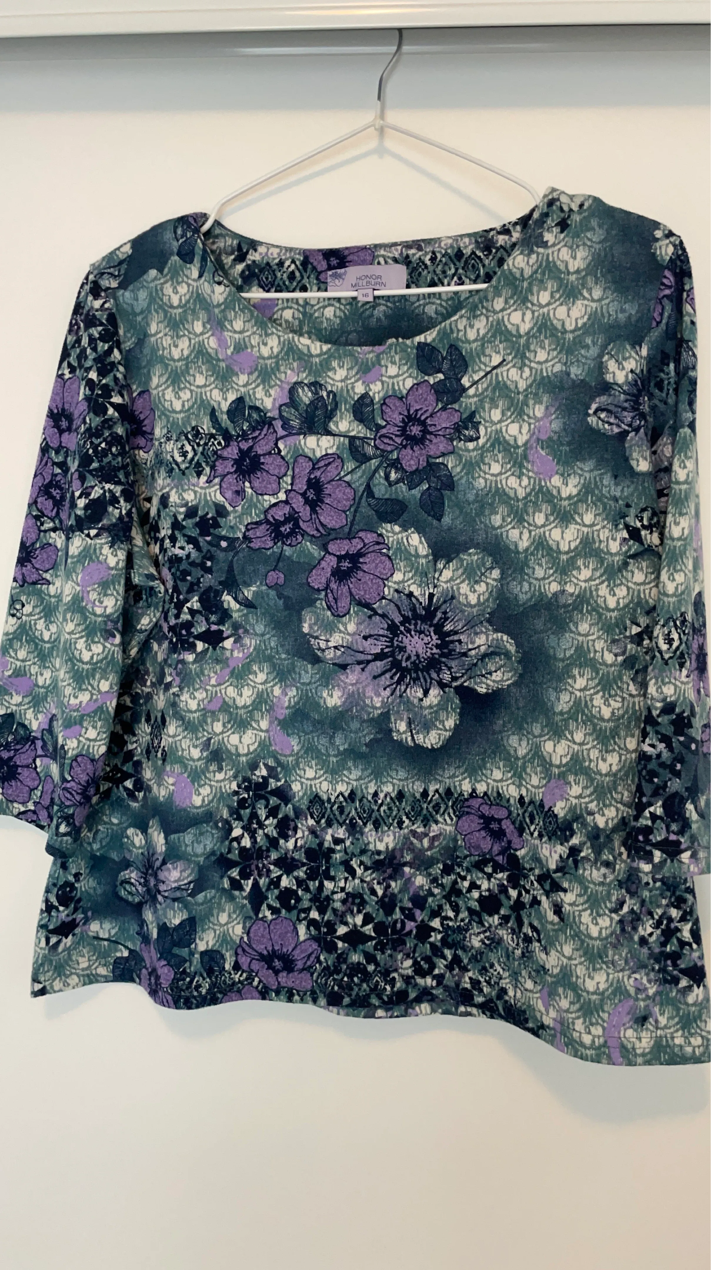 Honor Millburn top with a beautiful floral and abstract print. Features 3/4 length sleeves and a comfortable neckline. Size 16 from the UK so Canadian size 12 Fabric is a polyester blend. Soft jumper like top