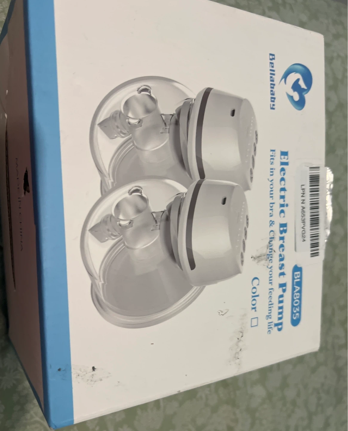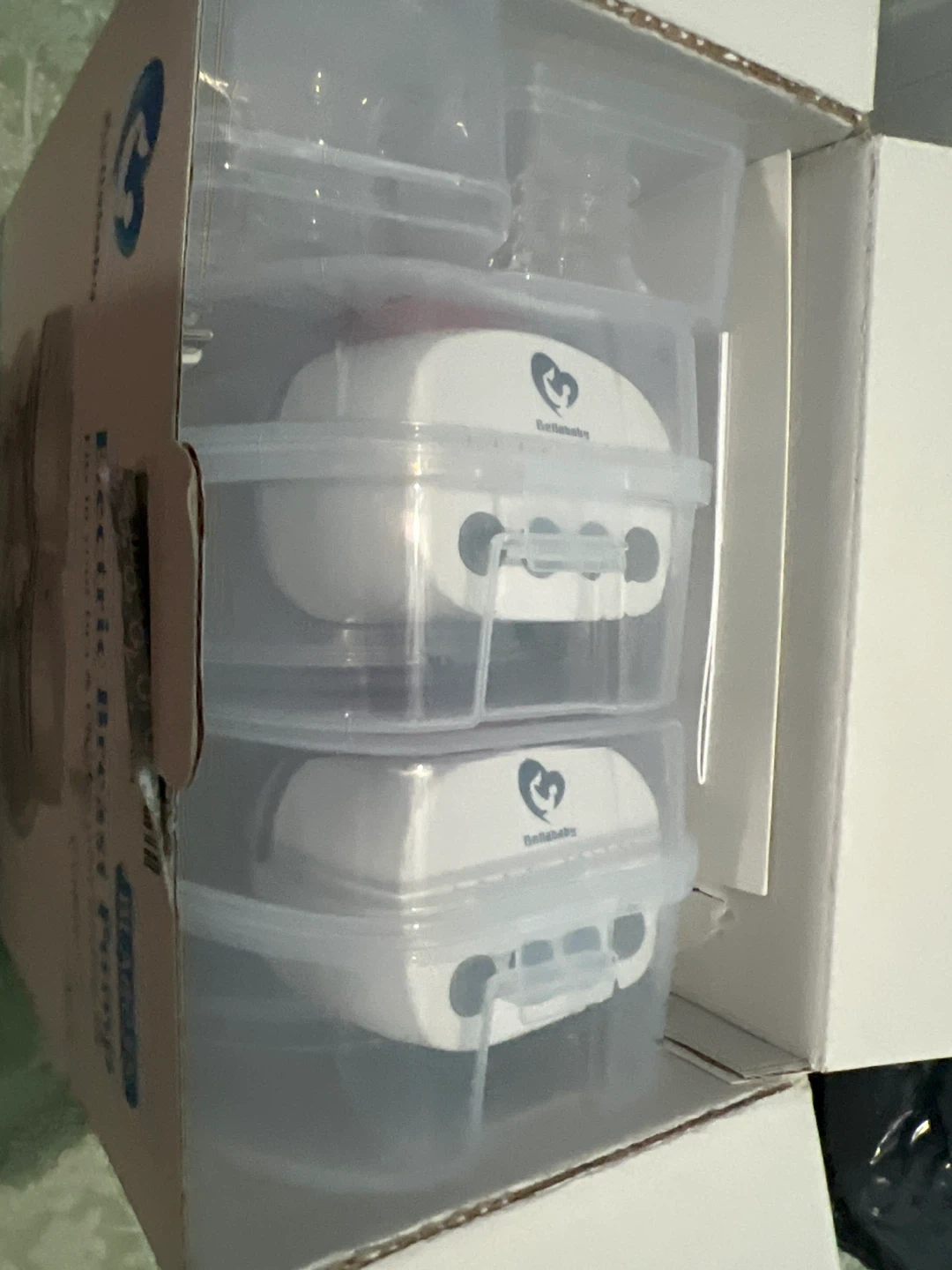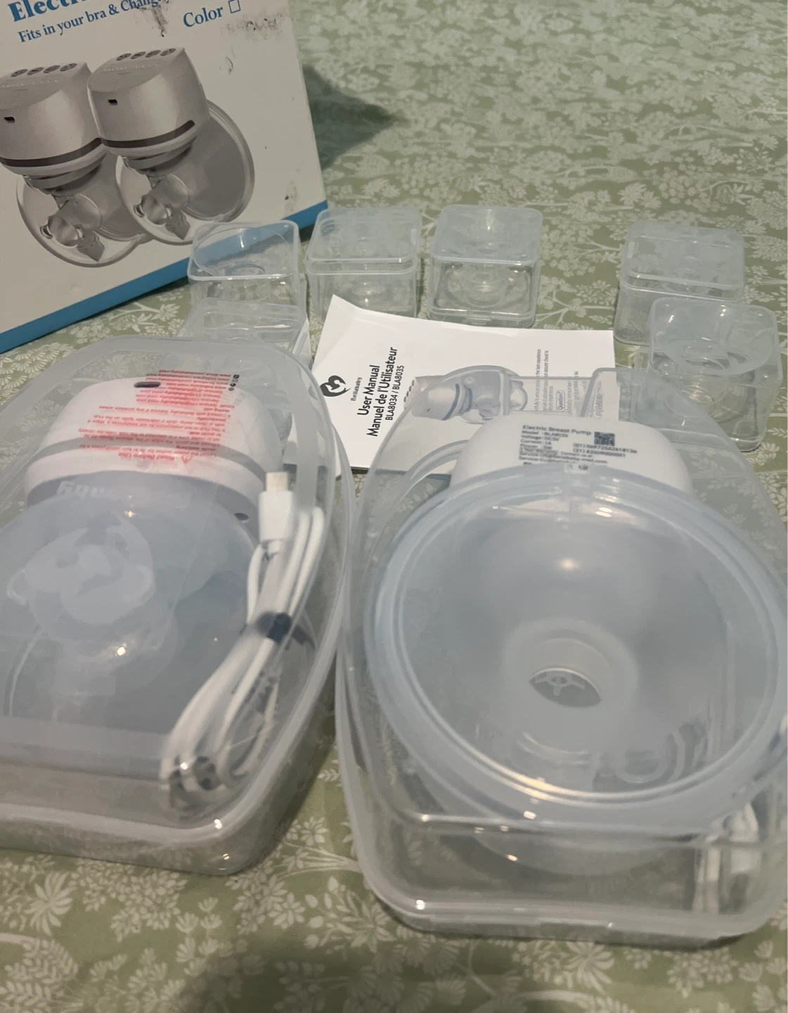 Bellababy wearable electric breast pump. Includes pump motors, collection cups, tubing, and charging cables. This pump fits discreetly in your bra for hands-free pumping. It's rechargeable and designed for comfortable milk expression.