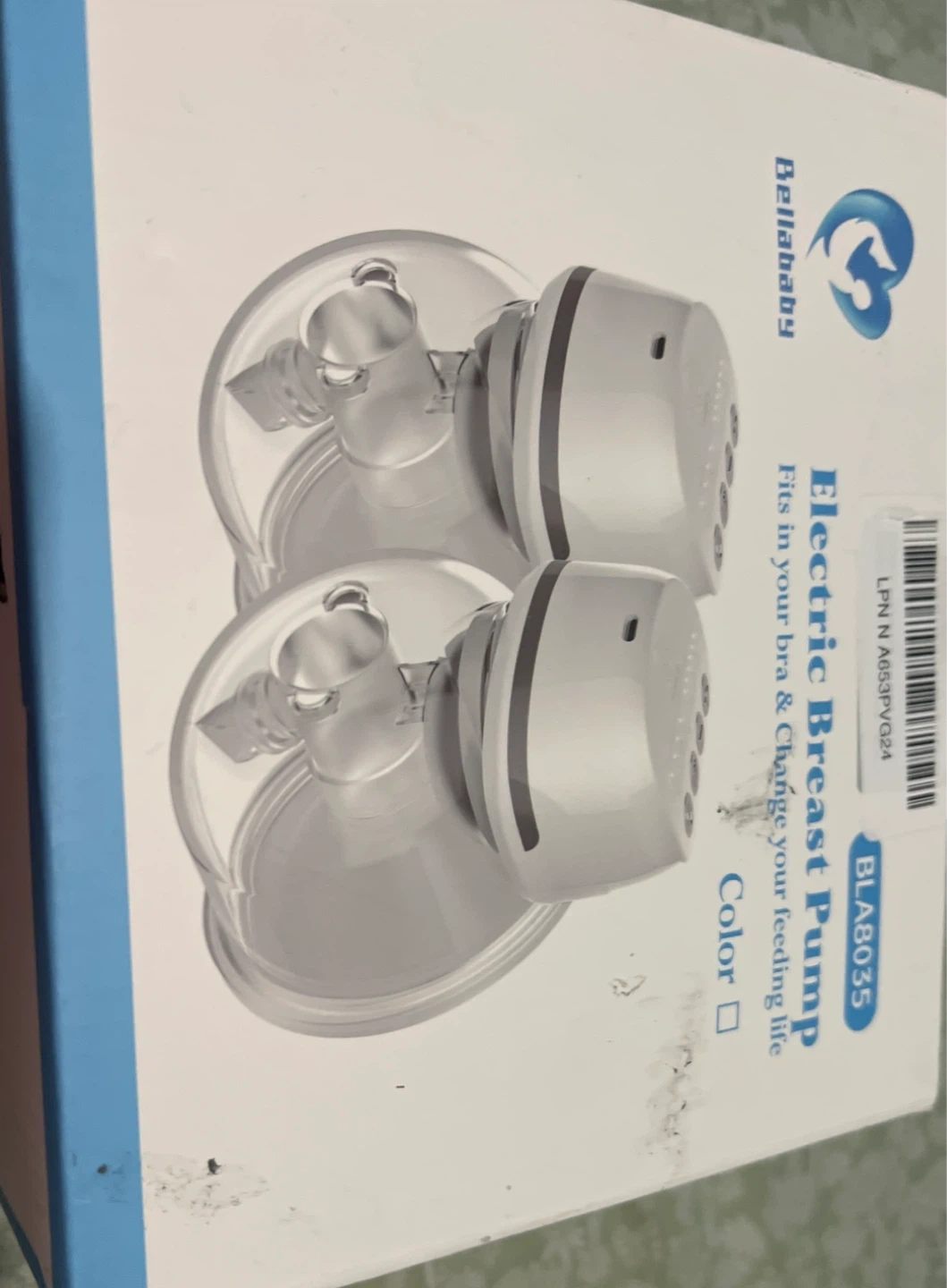 Bellababy wearable electric breast pump. Includes pump motors, collection cups, tubing, and charging cables. This pump fits discreetly in your bra for hands-free pumping. It's rechargeable and designed for comfortable milk expression.