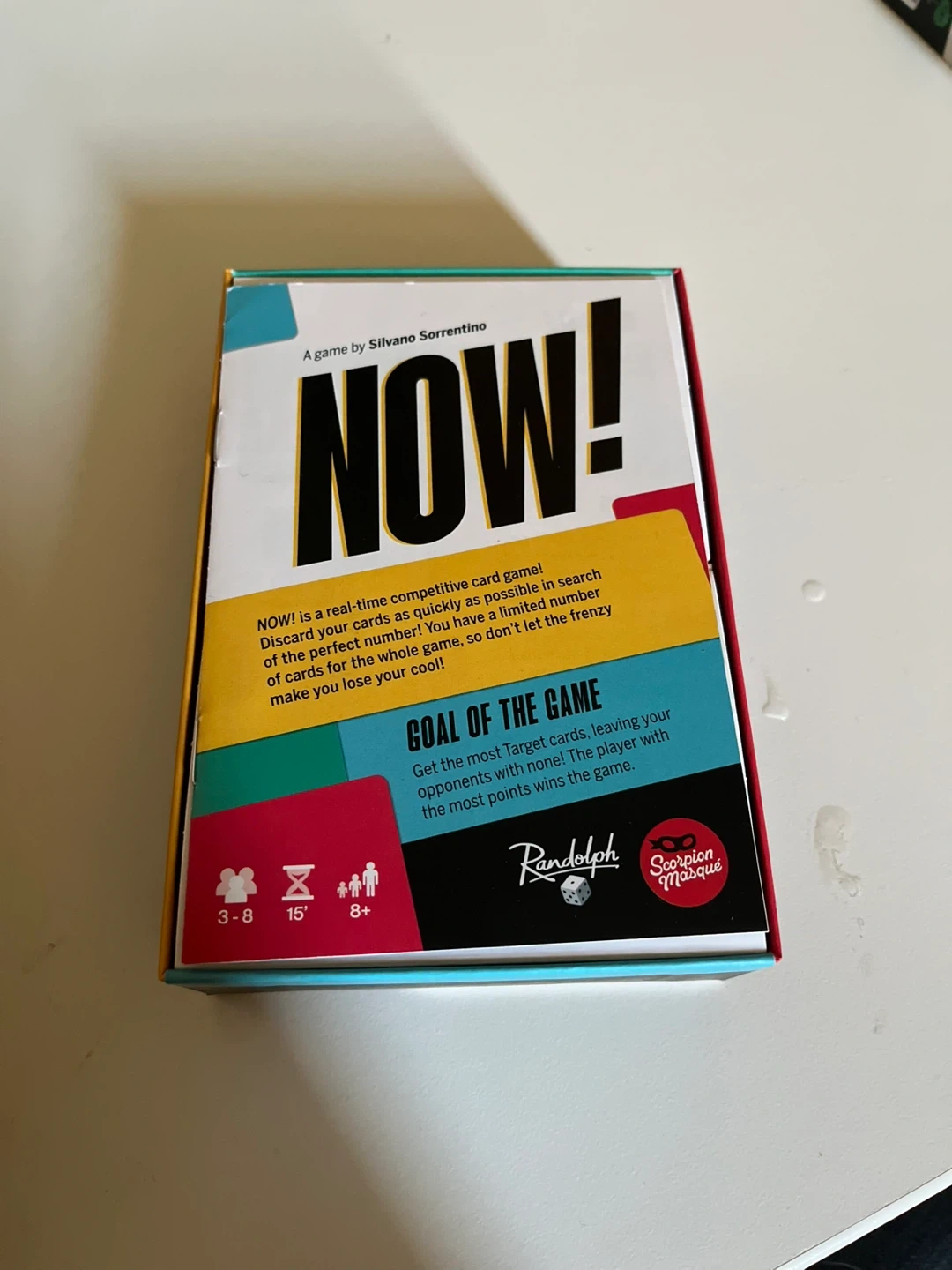 NOW! is a fun, real-time competitive card game where players discard cards as quickly as possible. It's designed for 3-8 players and recommended for ages 8 and up. The goal is to get the most target cards without running out of your own! This fast-paced game will keep everyone engaged.