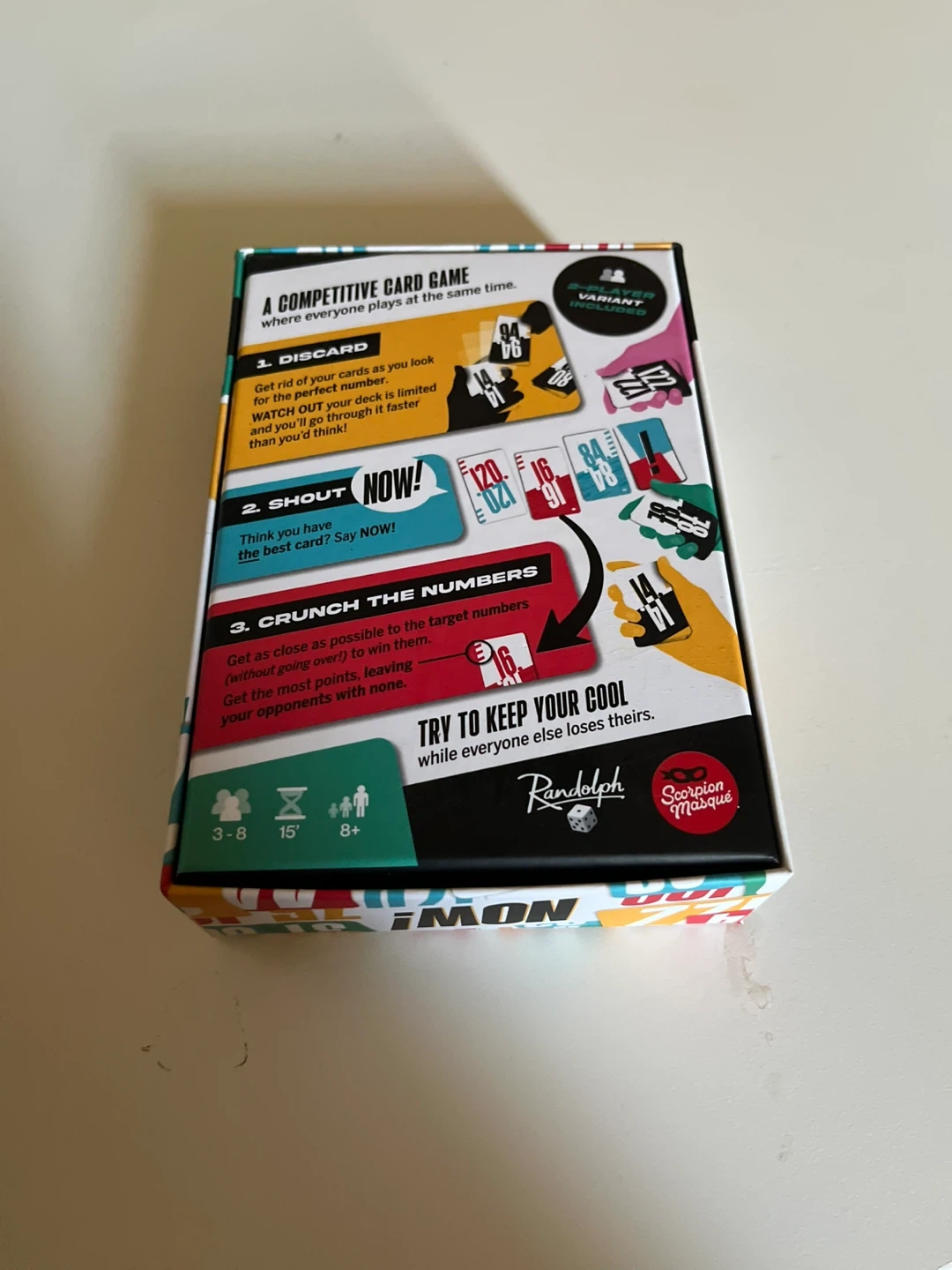 NOW! is a fun, real-time competitive card game where players discard cards as quickly as possible. It's designed for 3-8 players and recommended for ages 8 and up. The goal is to get the most target cards without running out of your own! This fast-paced game will keep everyone engaged.