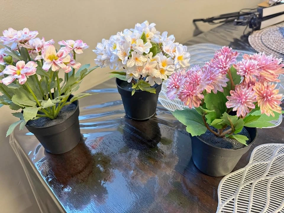Cute artificial flowers. Has 3 pots with pink and white flowers. Great for home decor. Very good quality. Like NEW.