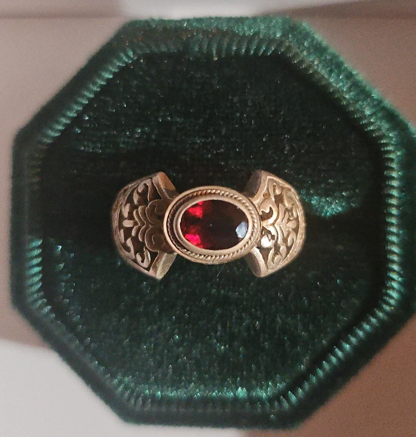 This is a beautiful antique ring featuring an oval-cut garnet gemstone. It's set in a silver with intricate scrollwork on the band. The gemstone appears to be a deep red colour. The ring not the box. Size 7.5