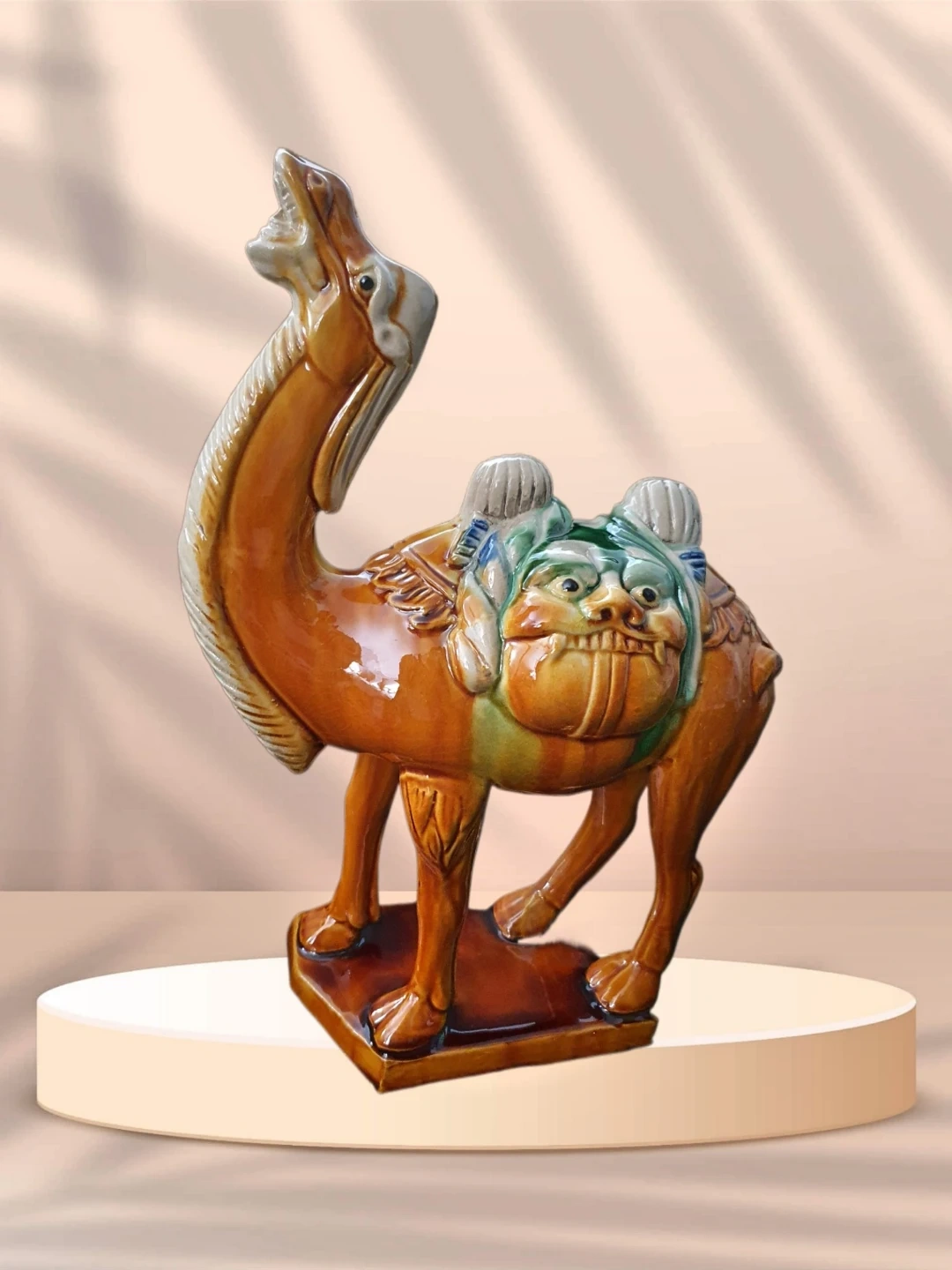 Vibrant amber, emerald-green, and creamy glazes catch the light beautifully on the proud prancing horse and majestic Bactrian camel β both bursting with authentic Luoyang detail, ornate saddles, and lifelike expressions.